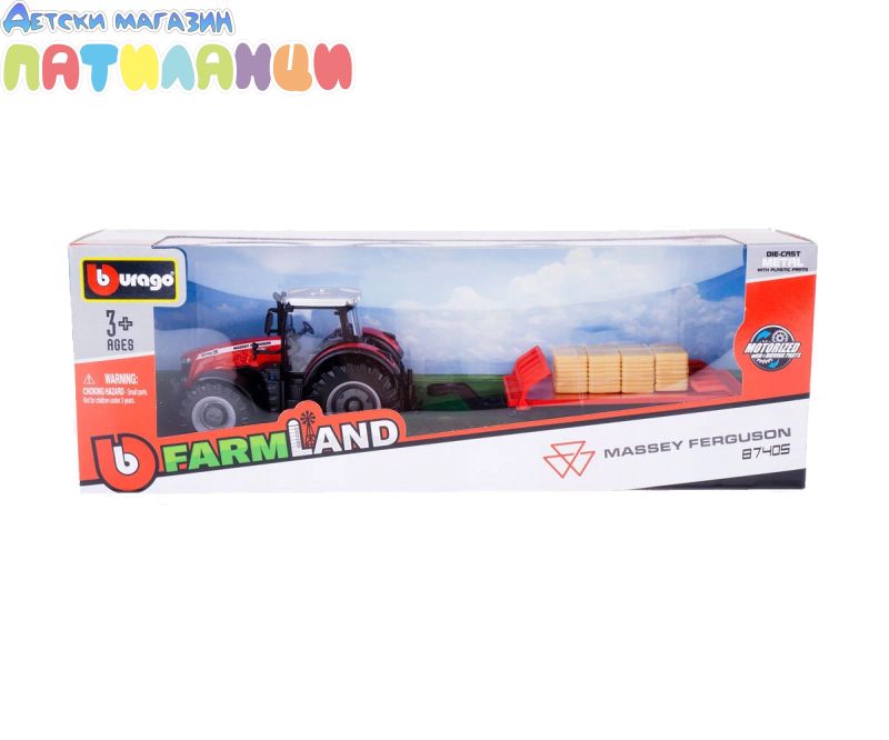 Име: Bburago - Трактор с ремарке 10 см, Massey Ferguson 8740S, червен с ремарке за бали