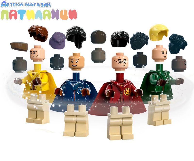 4 минифигури от LEGO® с възможност за персонализиране – Хари Потър, Драко Малфой, Седрик Дигъри и Чо Чан, плюс 10 допълнителни глави (6 различни цвята на кожата) и 10 допълнителни прически за създаване на уникални играчи;