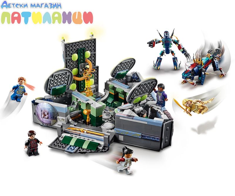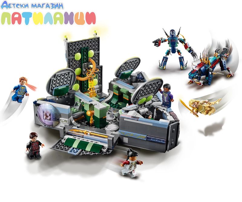 Разгледайте космическия кораб на Eternals заедно с Makkari, Ikaris, Thena, Sersi, Druig и Phastos. Отворете страницата, за да получите достъп до интериора. Проверете пилотската кабина, оръжейната зала и лабораторията, но когато лидерът на Deviants пристигне със своя съучастник, е време да започнете битка с космическия кораб! Освен това... Ако съберете минифигурки LEGO® Eternals, този комплект е единственият, в който ще откриете Druig и Phastos!