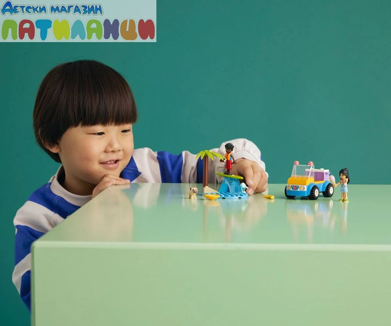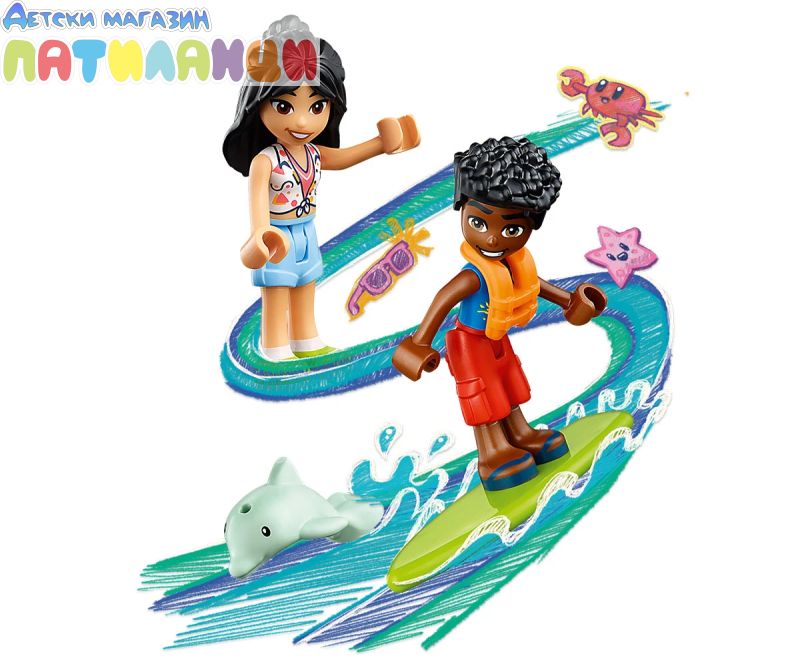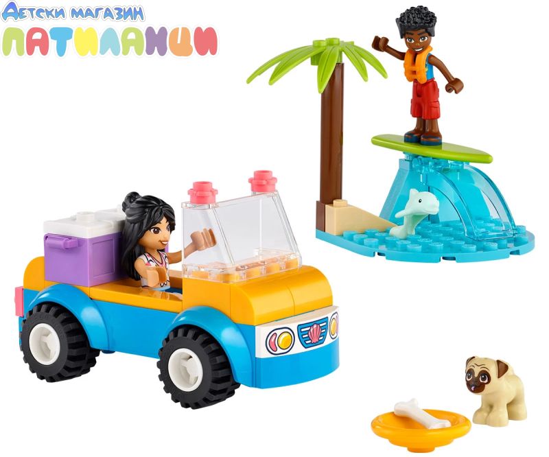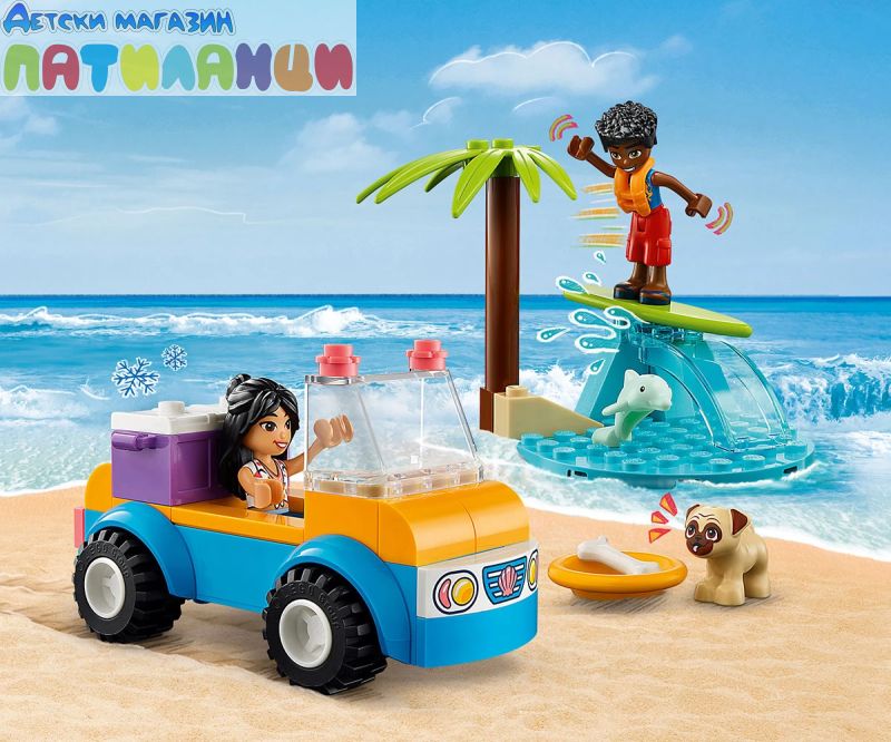 Забавен ден на плажа! Лиан пристига с плажното си бъги, готова да се срещне с приятеля си Зак. Тя е донесла своя охладител, пълен с банан и вкусен сладолед. Зак сърфира по вълните, когато малко делфинче се появява и плува до него. Докато приятелите се наслаждават на слънчевите лъчи, домашното куче Данго на Зак си почива с кокал под сянката на палмово дърво. Какъв страхотен ден! Вдъхновете въображението със строителния комплект LEGO® Friends, който учи децата да конструират и да се наслаждават на творчески ролеви игри на плажа.