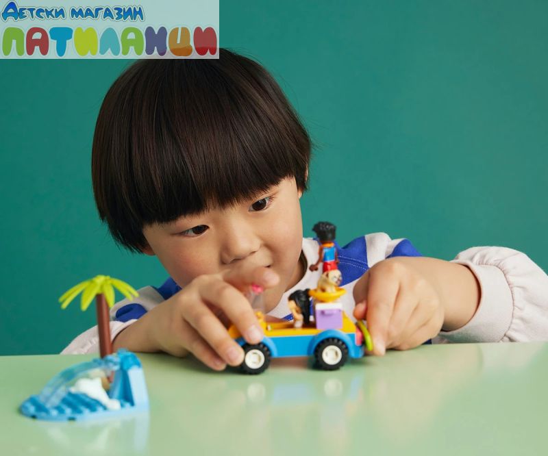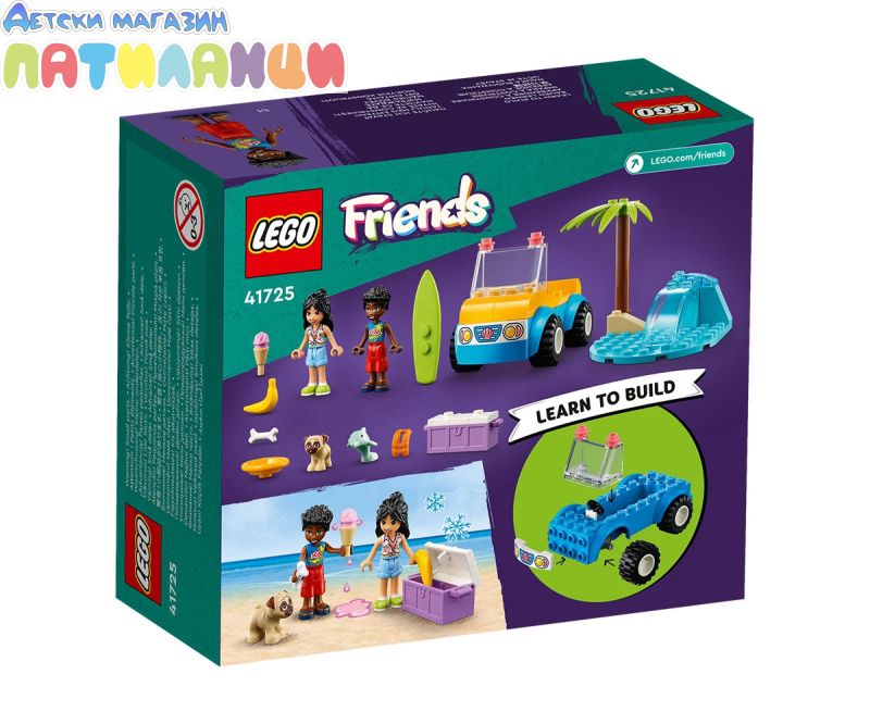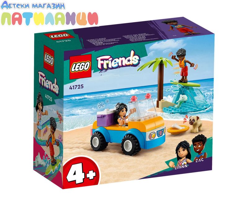 Децата на възраст над 4 години, които обичат да играят на плажа, могат да създават истории с комплекта LEGO® Friends Забавления с плажно бъги (41725). Комплектът с играчки помага на децата да се научат да строят, докато проявяват творчество с героите Лиан и Зак.