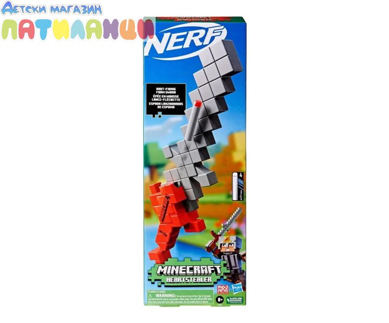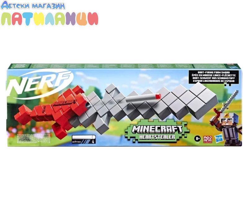 Нърф и Майнкрафт се обединяват за да ви представят меча Heartstealer, вдъхновен от популярната игра Minecraft Dungeons! Мечът пуска стрела от пяна Nerf, за да се забавлявате играейки по 2 различни начина в игри на закрито и открито. Представете си себе си в света на Minecraft Dungeons и вие сте готови за приключение. Мечът изстрелва по 1 стрела и е лесен за използване. Включва и 4 стрелички от пяна Nerf Elite. Това е страхотна играчка за момчета и момичета и страхотен подарък за феновете на Minecraft.