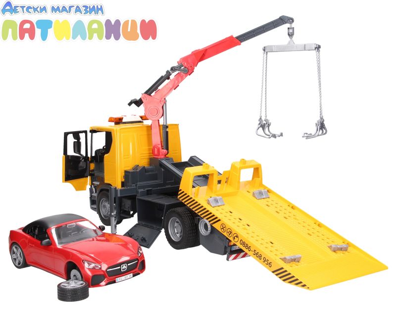Платформата може да се спусне, за да се извадят превозни средства. Възможно е и товарене на превозни средства с помощта на крана. който може да бъде удължен и завъртян. В този процес товарният колан, състоящ се от вериги и скоби за колела, позволява безопасно и бързо повдигане и товарене. Подпорите за колелата и сгъваемите опори закрепват автомобила и гумите на протектора заобикалят тежкотоварното превозно средство. Кабината на камиона MAN TGS с много детайли разполага с отварящи се врати и сгъваеми огледала на кабината. Модулът за светлина и звук също е предварително инсталиран. Новият роудстър BRUDER разполага с подвижен покрив и може да побере всяка фигура от bworld. Роудстърът BRUDER идва с новата система за смяна на колела за още по-голямо забавление.