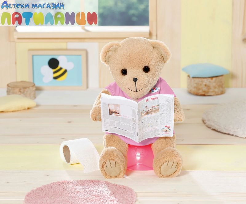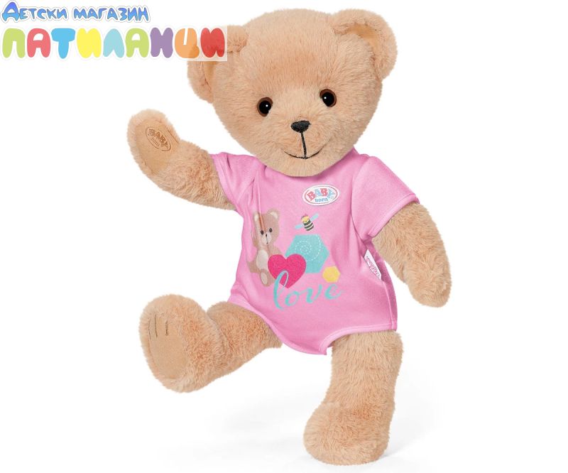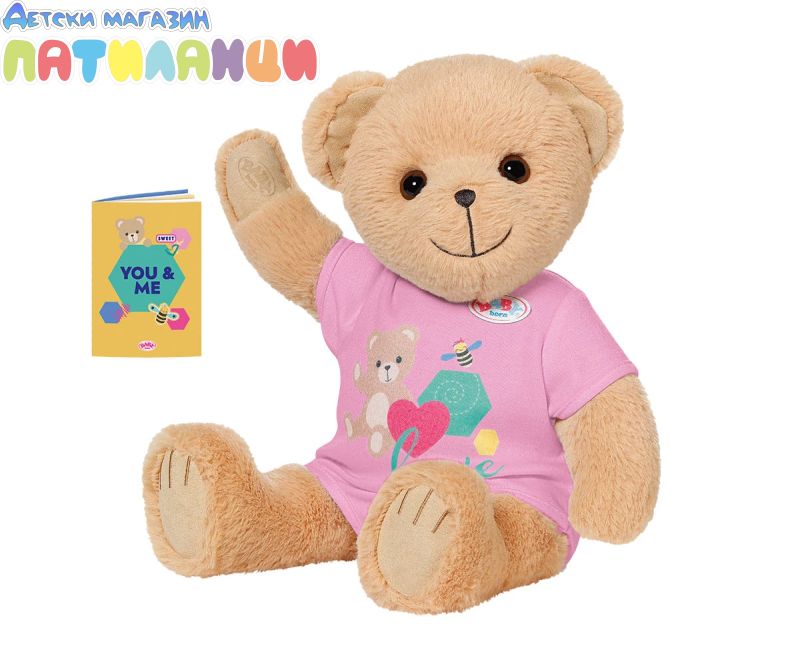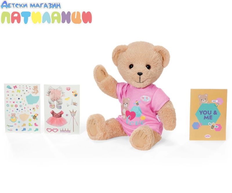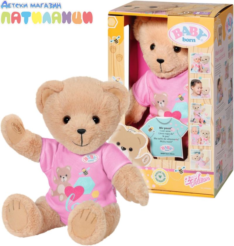 Твоят нов приятел е вече тук - за момичета, момчета и кукли BABY born. Заедно те откриват света на BABY born. Те споделят дрехи, аксесоари и прегръдки. Мечето може да бъде каквото искате – момиче, момче или еднорог. Просто със смяна на тоалета (можете да закупите допълнителни дрешки тук). Нов приятел за игра, който може да бъде облечен и позициониран като кукла, но който е още по-гушкав. Има много плюшени играчки, но само едно мече, което истинските BABY born фенове желаят.