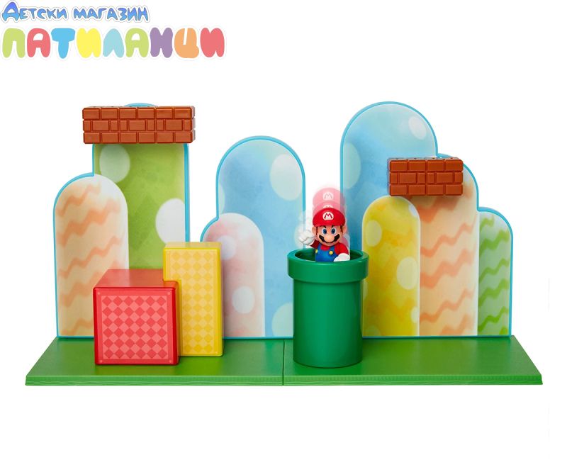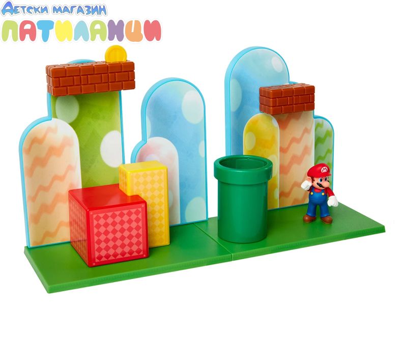Влезте в царството на Acorn Plains, където е първоначалната играта на Марио. Скачайте по платформи, събирайте монети и се бийте със злодеи. Използвайте зелената тръба, за да достигнете бонус нивата. Този фантастичен комплект ви позволява да пресъздадете геймплея, познат от популярните платформени игри на Nintendo. Продуктът е с подвижни части, които разнообразяват забавлението. Комплектът Super Mario е страхотна идея за подарък за любителите на игрите на Nintendo.