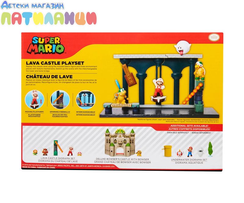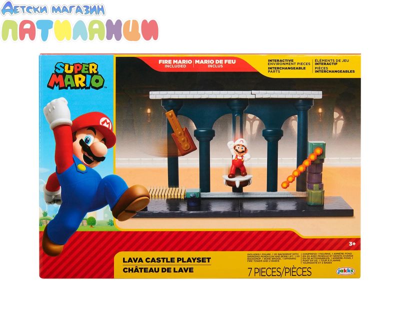 Игралният комплект Lava Castle ви позволява да преиграете това класическо ниво от видеоигрите Super Mario™. Можете да пресъздадете играта, като използвате включената фигура Fire Mario от 6 см, като го навигирате през различни препятствия. Огнените топки се въртят около кулата точно както в играта. Кулата с огнена топка е модулна и може да се използва и с други комплекти за игра.