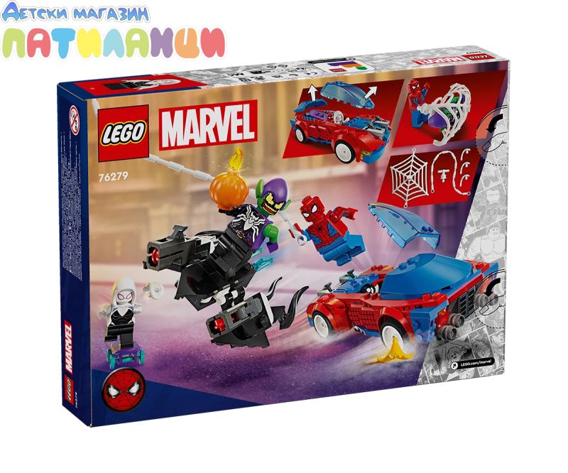 Феновете на екшъна със супергерои, минифигурите на Marvel и страхотните превозни средства ще бъдат удивени от играчката за конструиране от LEGO® Marvel, включваща колата на Спайдърмен, планера на Зеления гоблин и скейтборда на Призрачния паяк. „Състезателната кола на Спайдърмен с Венъм и Зеления гоблин“ (76279) е модерна играчка, която е страхотен подарък за момчета и момичета на възраст над 7 години.