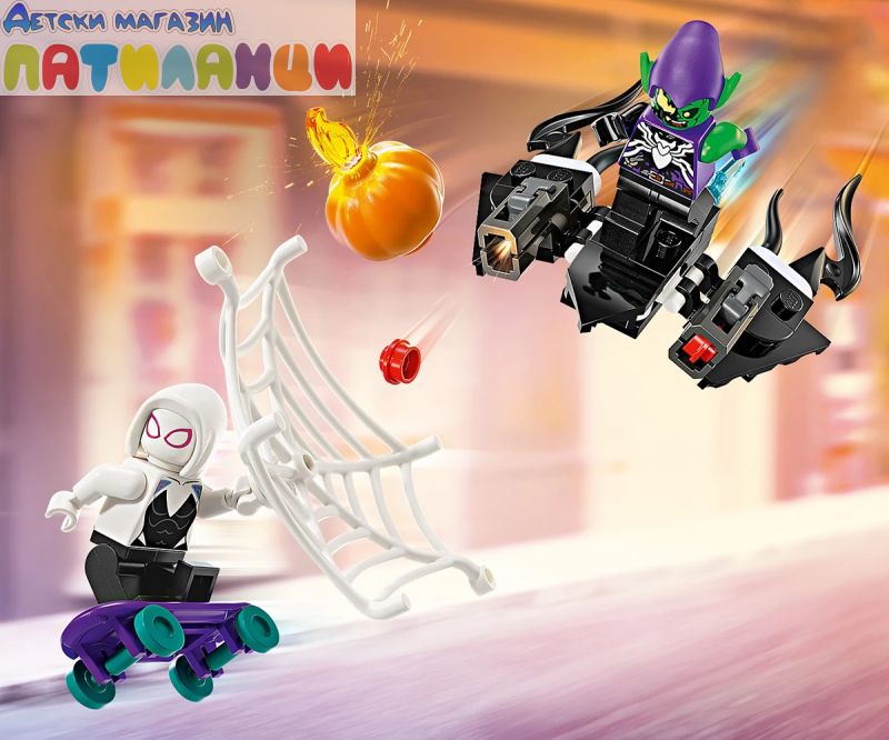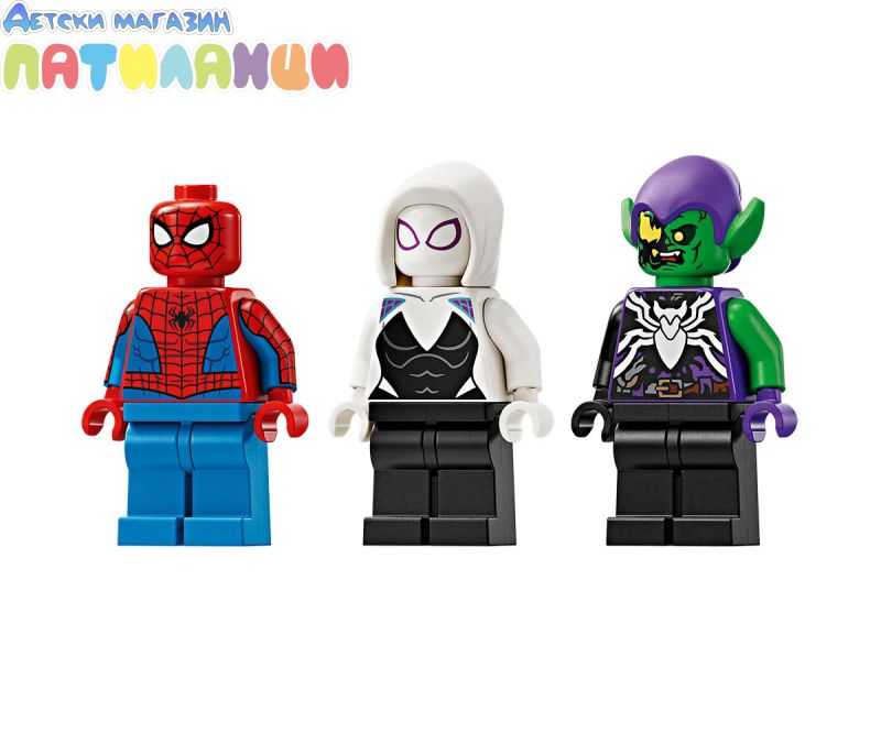 - Битки на колела със супергерои от LEGO® – колата на Спайдърмен има 2 предни оръдия, планерът на Зеления гоблин има 2 оръдия, а Призрачния паяк носи 2 ръчни оръжия, изстрелващи паяжина, и се вози на скейтборда си