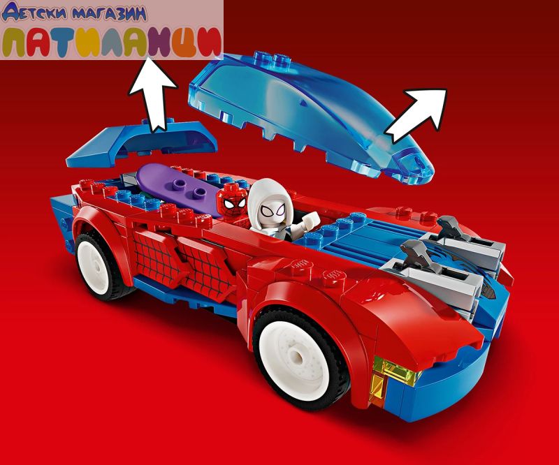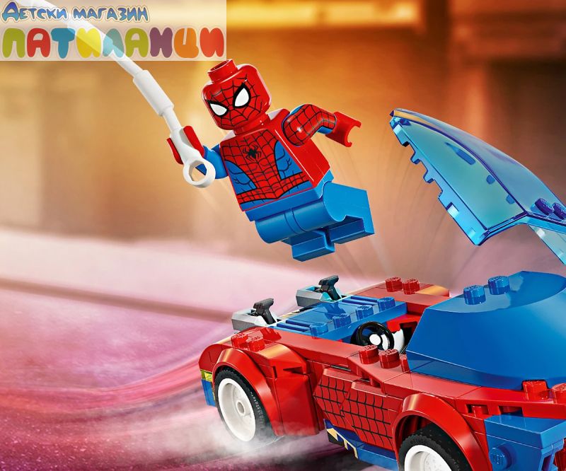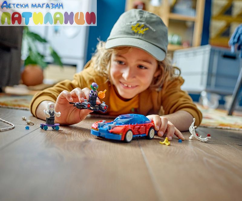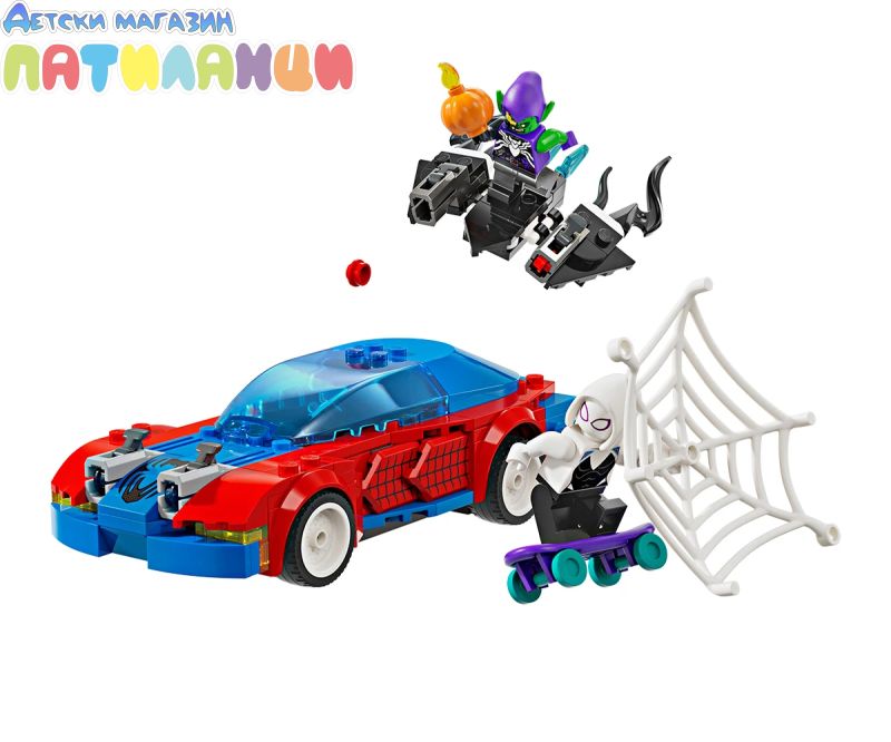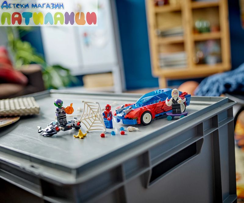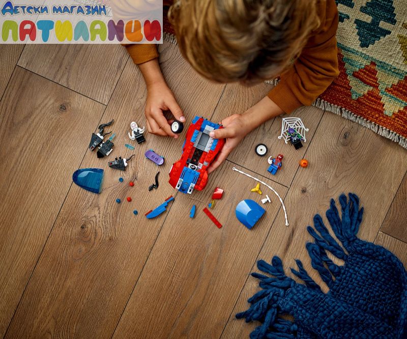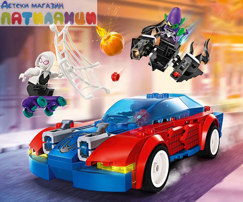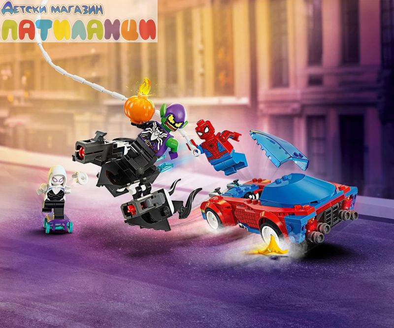 - Екшън играчка за конструиране и игра – включва кола за конструиране за деца, оръжия, аксесоари, минифигури на героите Спайдърмен и Призрачния паяк от LEGO® Marvel и минифигура на Венъм Зеления Гоблин