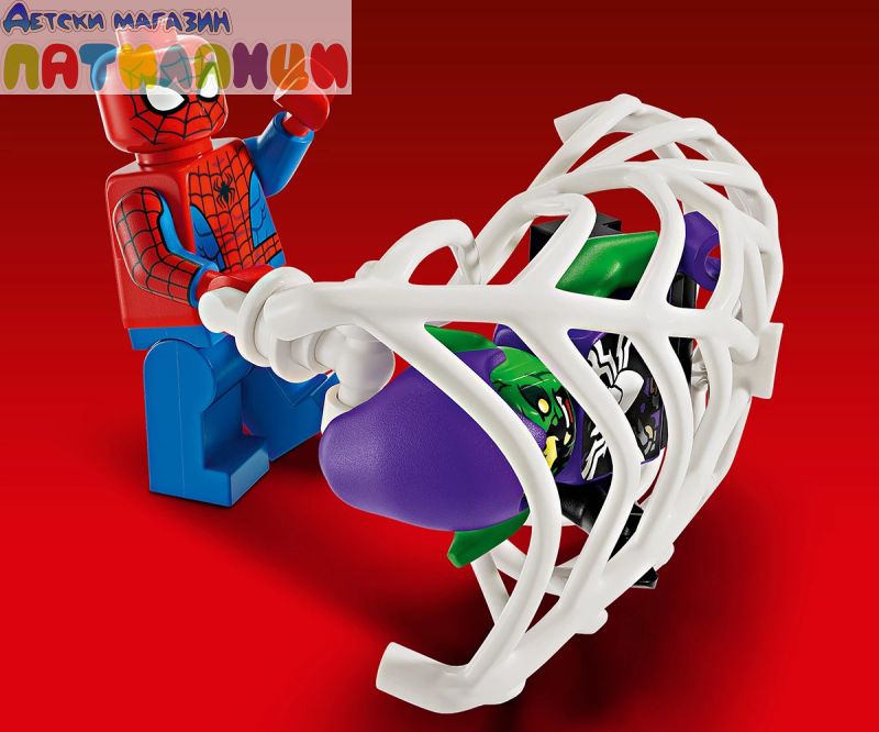 Спайдърмен, Призрачният паяк и Венъм Зеленият гоблин участват в бърз боен екшън със страхотен асортимент от превозни средства, оръжия и аксесоари. Колата на Спайдърмен има 2 предни оръдия, планерът на Зеления гоблин има 2 оръдия и той носи тиквени бомби, а Призрачният паяк използва 2 ръчни бластера, изстрелващи паяжина, докато кара скейтборда си. Спайдърмен се люлее на гъвкаво „въже“ от паяжина и използва голяма, огъваща се паяжина, за да лови злодеи. Подвижните части осигуряват достъп до интериора на колата, която е достатъчно голяма, за да побере 2 минифигури и скейтборда. За допълнително цифрово забавление строителите могат да мащабират, да завъртат модели в 3D и да проследяват напредъка си с помощта на забавното, интуитивно приложение LEGO Builder.
