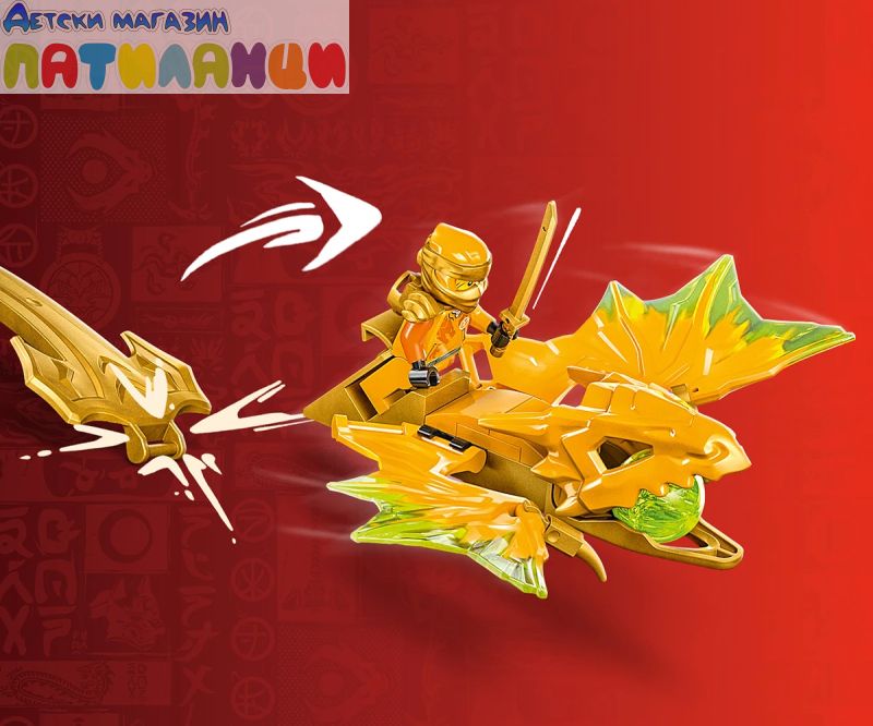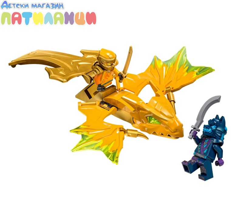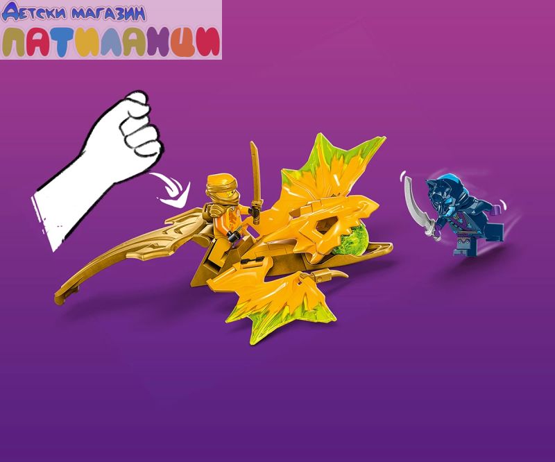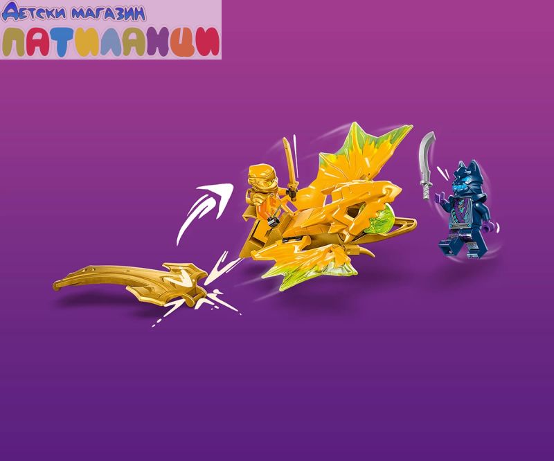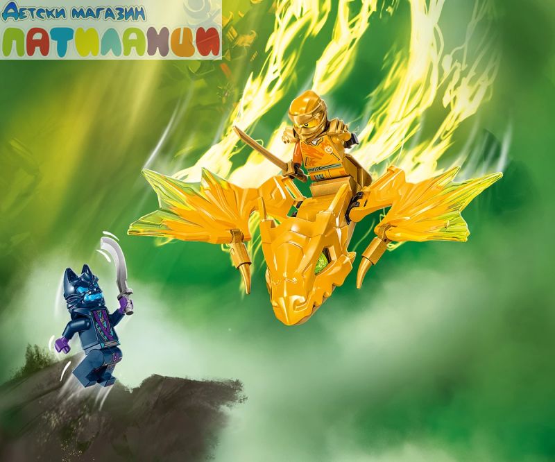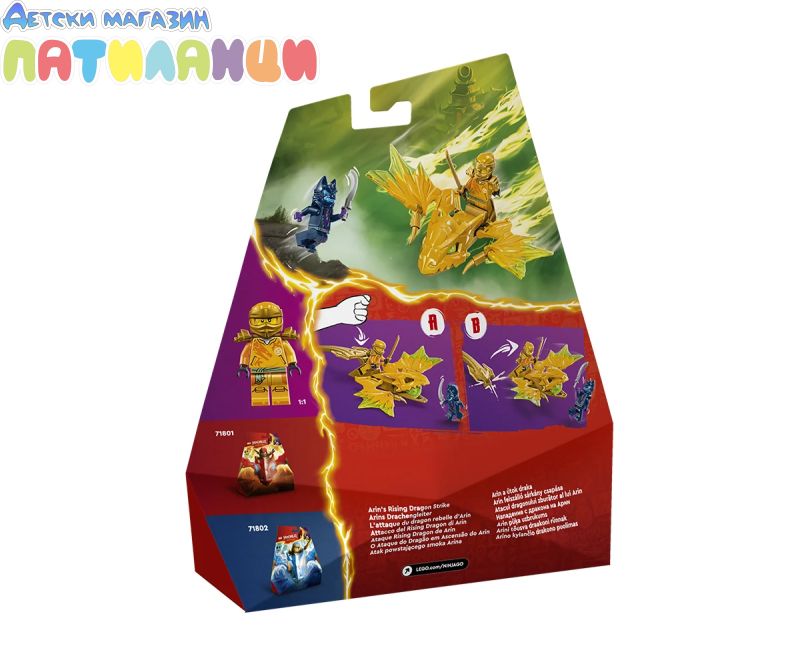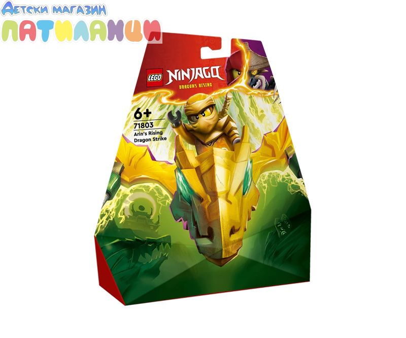 Момчета и момичета на възраст над 6 години могат да пресъздават любимите си сцени от сезон 2 на телевизионното шоу NINJAGO® Dragons Rising с играчката с нинджи LEGO® NINJAGO® Нападение с дракона на Арин (71803). Децата с вълнение ще построят първата по рода си екшън играчка LEGO® NINJAGO, преди да натиснат надолу златната опашка на дракона и да гледат как той се впуска в епични битки.