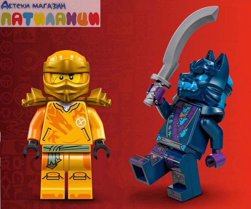 Подгответе се за изпълнени с екшън битки с нинджи, докато Арин излитащ дракон се изправя срещу воин с маска на вълк! Поставете Арин на гърба на дракона, натиснете надолу опашката му и гледайте как Арин става по-могъщ от драконската сила и се впуска в битка! Може ли да събори злия воин вълк, който размахва опасния си меч? Ще успее ли да спаси новия свят на NINJAGO®? Всичко зависи от вас!