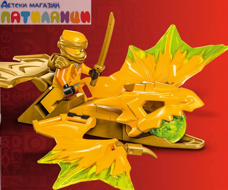 Екшън играчка с нинджи – децатамогат да поставят Арин излитащ дракон на гърба на жълтия дракон, да натиснат надолу златната му опашка и да изстрелят и двамата във въздуха