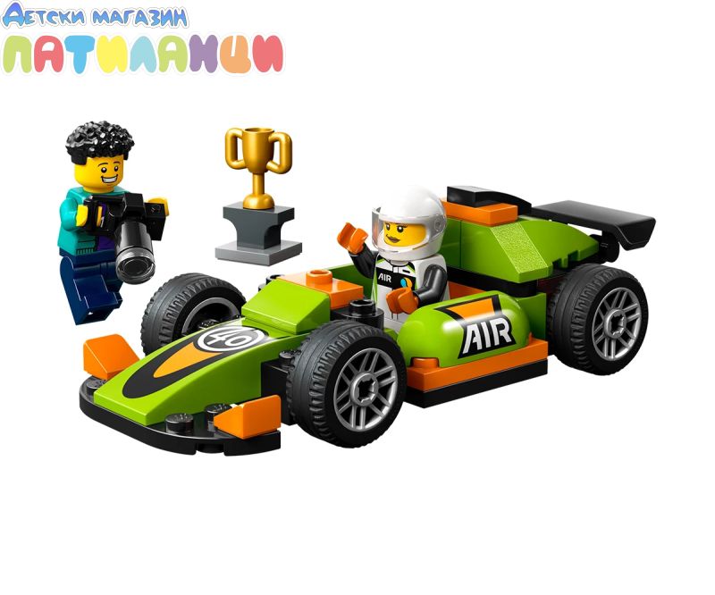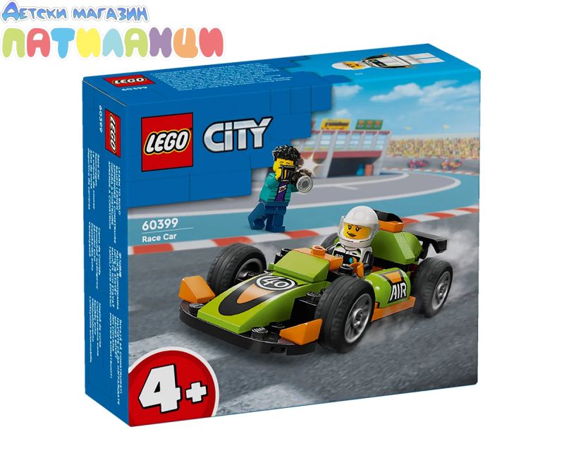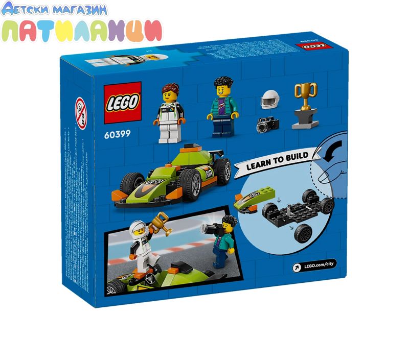 LEGO® City Зелена състезателна кола (60399) разкрива свят на творческа игра за деца над 4 години. Пригответе се да аплодирате своя малък състезател и да се насладите на играта заедно със състезателната кола от LEGO, включваща гладки гуми и страхотен заден спойлер. Комплектът включва също минифигури на фотограф и състезателен пилот, плюс трофей на победителя, за разказване на истории с въображение. Лесният за построяване комплект за игра е чудесен подарък за деца на възраст 4+. Той се предлага с начална тухличка LEGO, ръководство с картинки и 3D инструкции в приложението LEGO Builder – цифров помощник за построяване с интуитивни инструменти, които позволяват на децата да мащабират, завъртат и визуализират моделите от всички ъгли, докато строят. Комплектите за игра LEGO City поставят децата в центъра на екшъна с реалистични превозни средства, детайлни структури и вдъхновяващи герои за игри на въображението без ограничения. Комбинирайте превозното средство с други комплекти (продават се отделно) от гамата LEGO City за един безкраен свят от възможности за игра.
