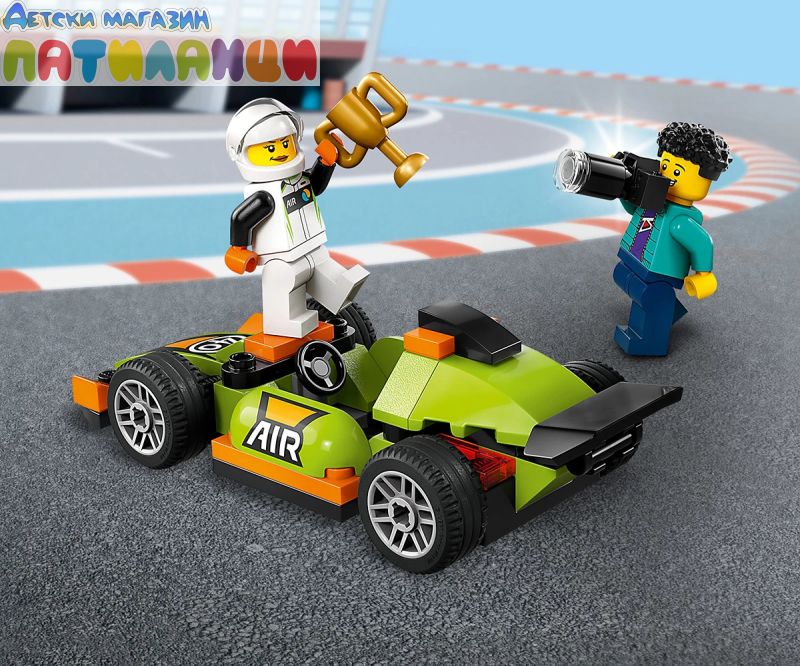 Подгответе се за високоскоростно забавление с LEGO® City Зелена състезателна кола. Седнете зад волана на страхотното състезателно превозно средство и се подгответе да дадете газ! Тръгнете с висока скорост, минавайте със свистящи гуми по завоите и профучете покрай фотографа, за да пресечете финала за рекордно време! След това направете почетна обиколка с трофея на победителя, преди да се отправите към следващата състезателна писта.