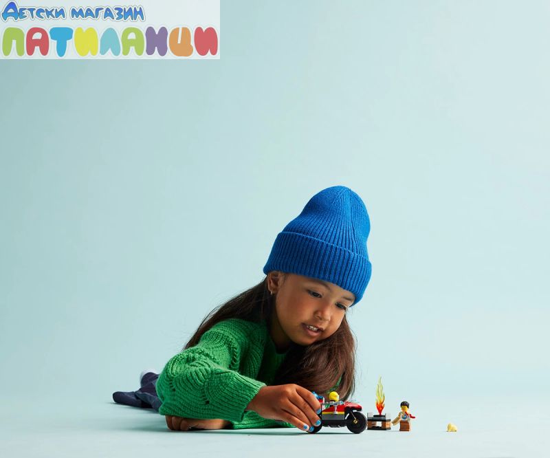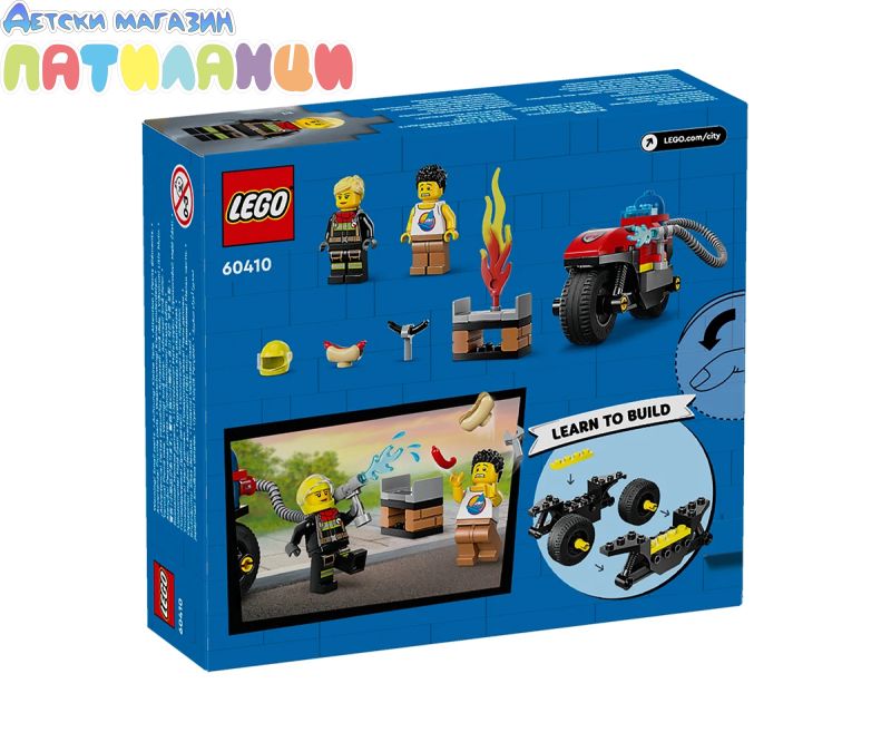 Какво има в кутията? – комплектът за игра със спасително превозно средство има всичко, от което децата се нуждаят, за да построят пожарникарски мотоциклет, сцена с пожар на барбекю и 2 минифигури, включително жена пожарникар