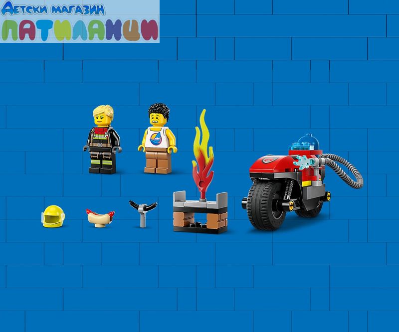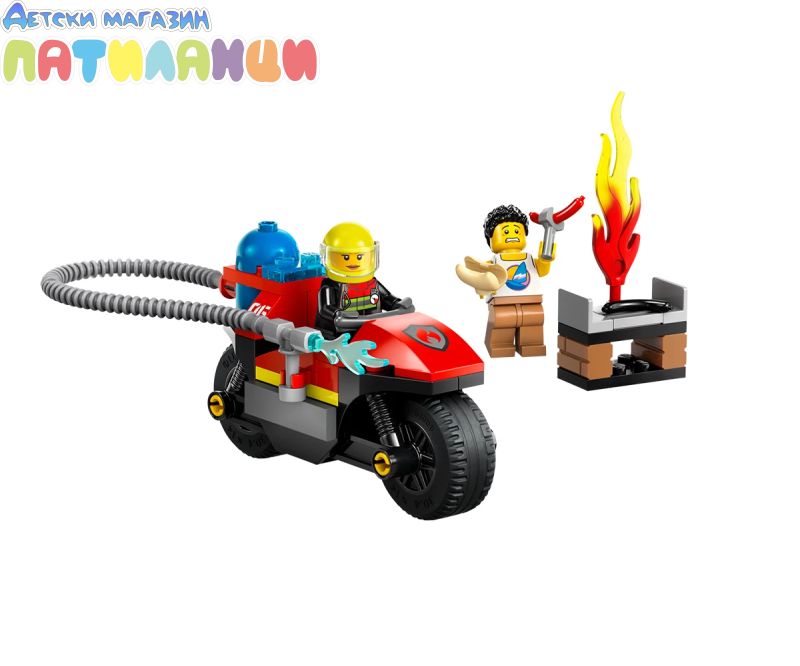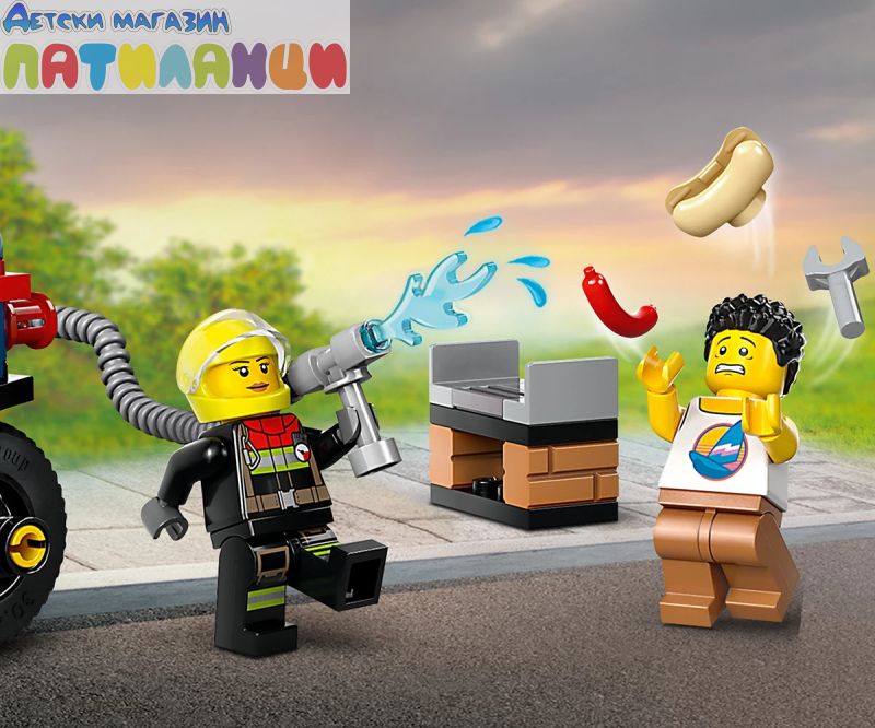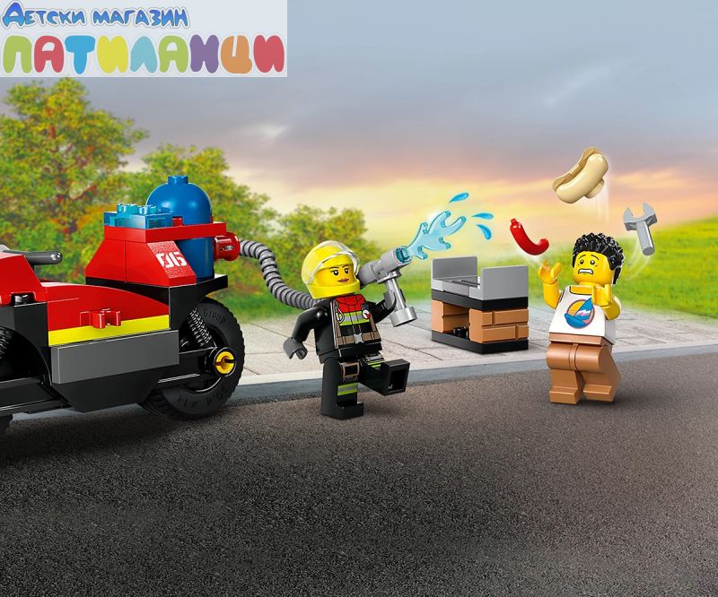 Уютното барбекю на гражданин се превърна в буен пожар! Извадете противопожарния мотоциклет и се изстреляйте към местопроизшествието. Машината е страхотна и много бърза със супер широки гуми, резервоар за вода и маркуч. Помогнете на пожарникаря да изгаси пламъците, за да спаси наденичката... и положението! Очакват ви забавни приключения в LEGO® City.
