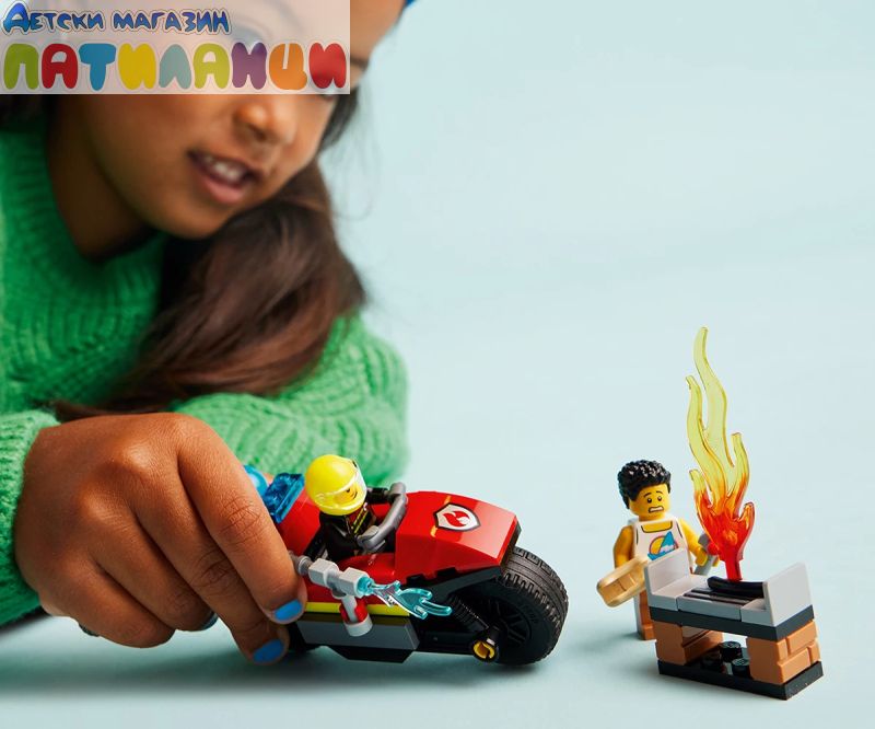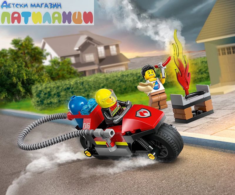 Изненадайте своя герой от ежедневието с комплекта за игра LEGO® City Противопожарен мотоциклет, включващ сцена с пожар и 2 минифигури за игра с въображение.
