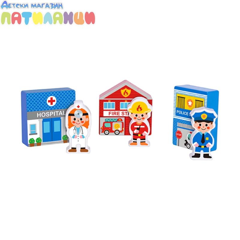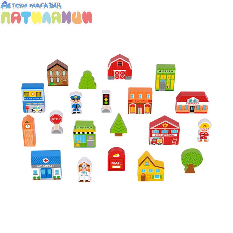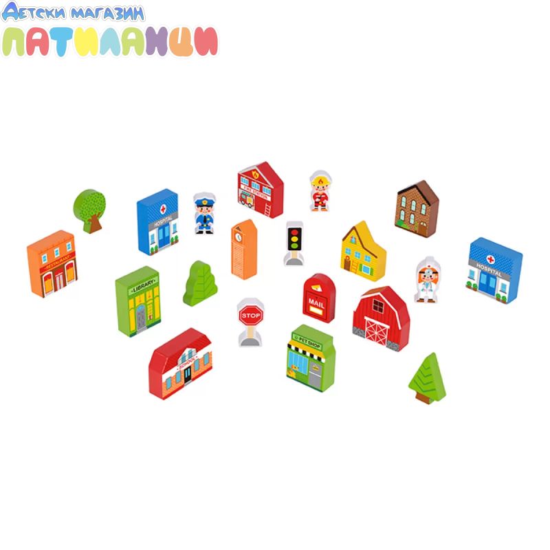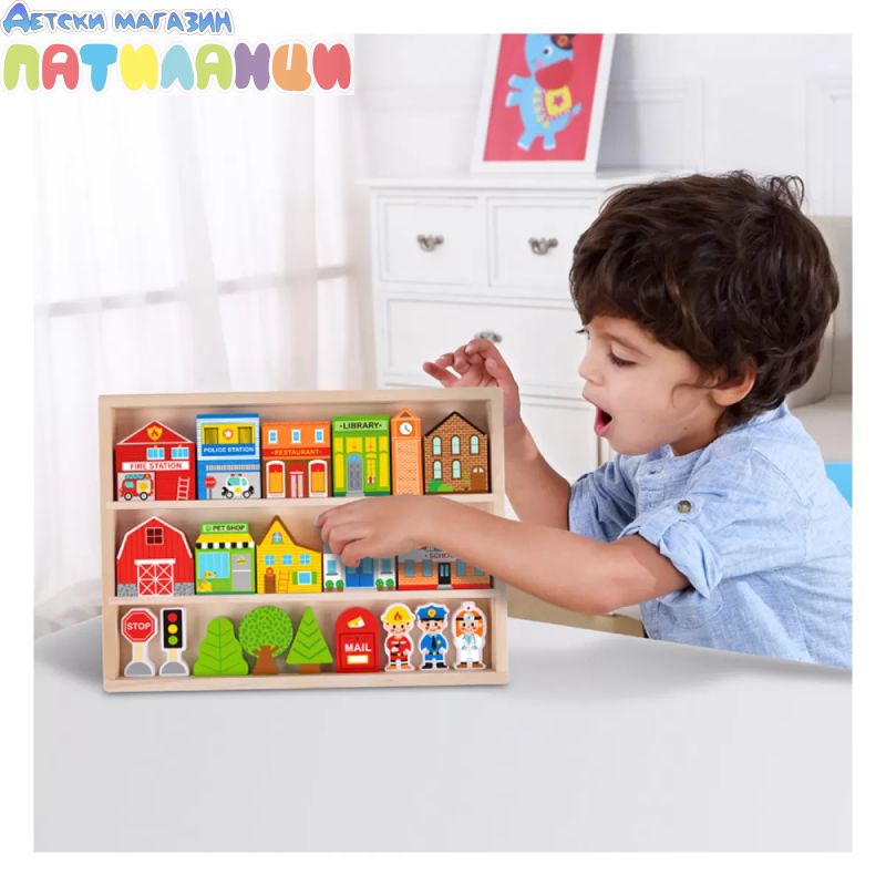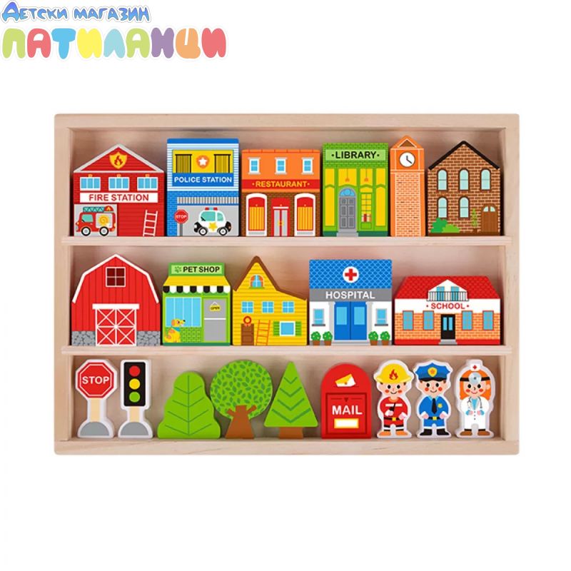 Дървената езда в града е образователна игра, вдъхновена от ежедневието. Играта се състои от фигури на хора, сгради и пътни знаци, които учат детето на всичко, което може да види в един град. Насочено е към деца над 3 години и е идеално за развитие на въображението и възприятието, но и за разбиране на външната среда. Дървената езда в града помага на детето да създава свои собствени истории, да се запознае с околната среда на града и да се обучава на правилата за движение по пътищата.