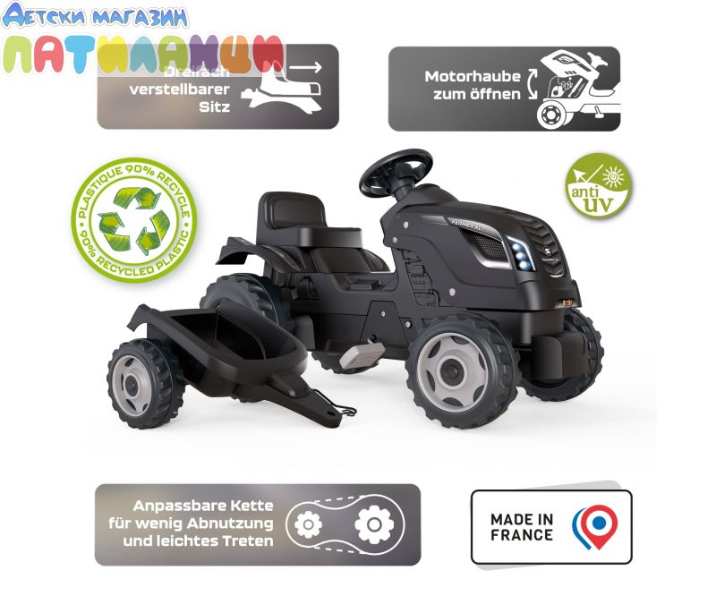 Иновативен и екологичен, това е Smoby! Smoby Tractor Farmer XL умело съчетава рециклиран материал и висококачествен нов пластмасов гранулат. Основната цел е безопасността на нашите малки авантюристи; Внимателната комбинация от материали осигурява перфектния баланс между стабилност и устойчивост.