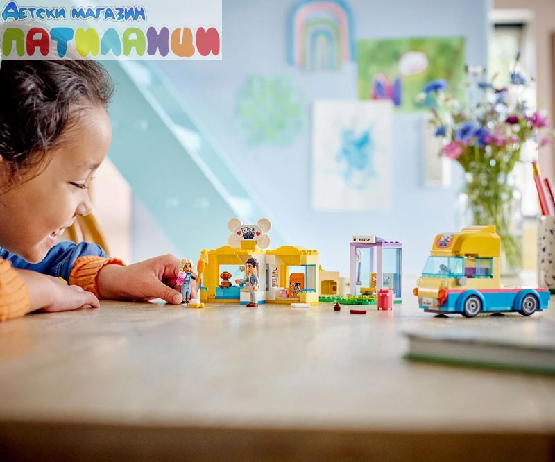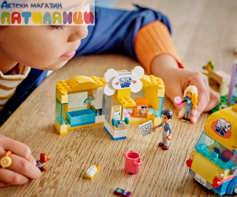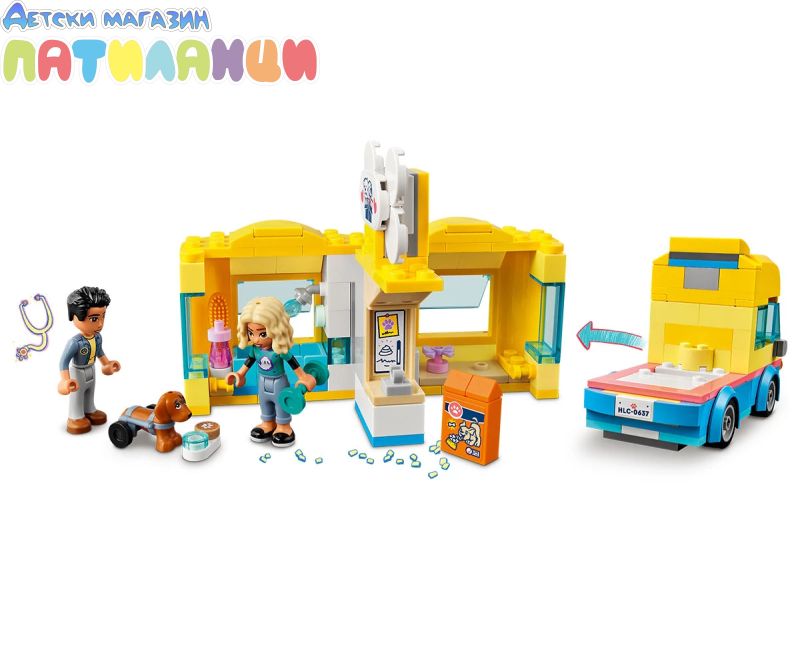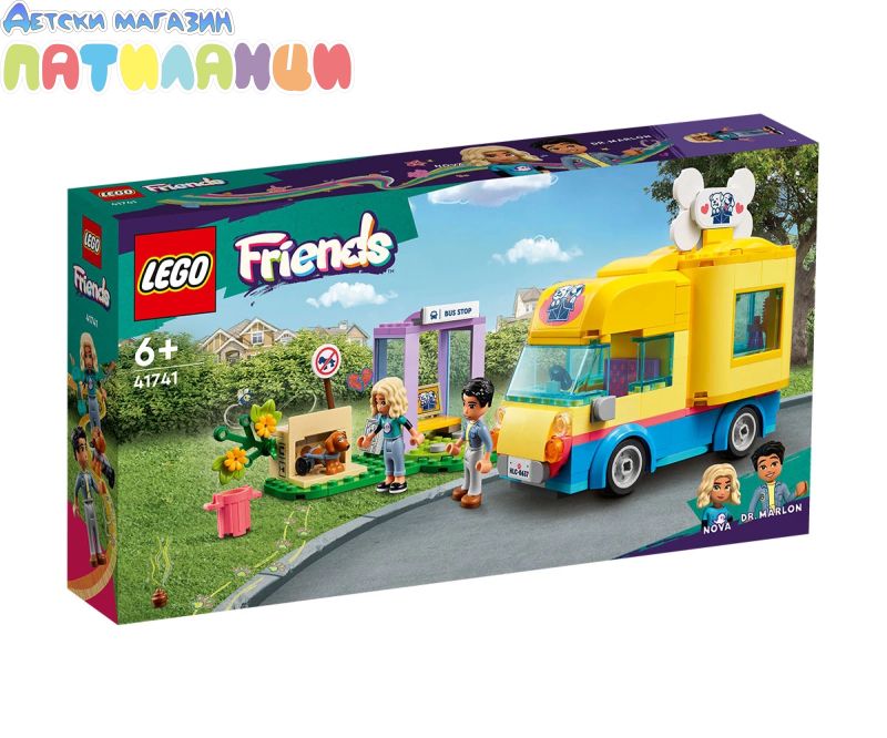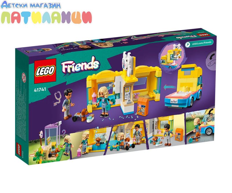 Любителите на животни над 6 години ще се насладят на спасяването и грижата за това очарователно кученце! Комплектът с играчки за построяване LEGO® Friends Микробус за спасяване на кучета (41741) е създаден за разказване на истории. Децата могат да накарат главата на кученцето да стърчи от картонената кутия, докато Нова минава покрай него, и след това да си представят, че се обаждат в спасителния център. Покривът на камиона се вдига, за да разкрие мобилния спасителен център, където децата ще намерят всичко необходимо, за да се грижат за кучето Пикъл. Аксесоарите включват вана за кучета, работна маса, четка, сапун, кофа за боклук, ако, вода и храна, плюс колела, които помагат на Пикъл да ходи. Децата с удоволствие ще променят тъжното изражение на Нова с щастливо, докато тя се грижи за Пикъл. Завладяващо строителство Пригответе се за лесно и интуитивно строително приключение с приложението LEGO Builder. С него децата могат да мащабират и завъртат 3D моделите, да записват комплекти и да проследяват напредъка си. Добре дошли в Хартлейк Сити от следващо поколение Децата се сприятеляват и откриват вълнуващи места във вселената на LEGO Friends, където могат да се наслаждават на творческа игра и да разиграват приключения от реалния живот.