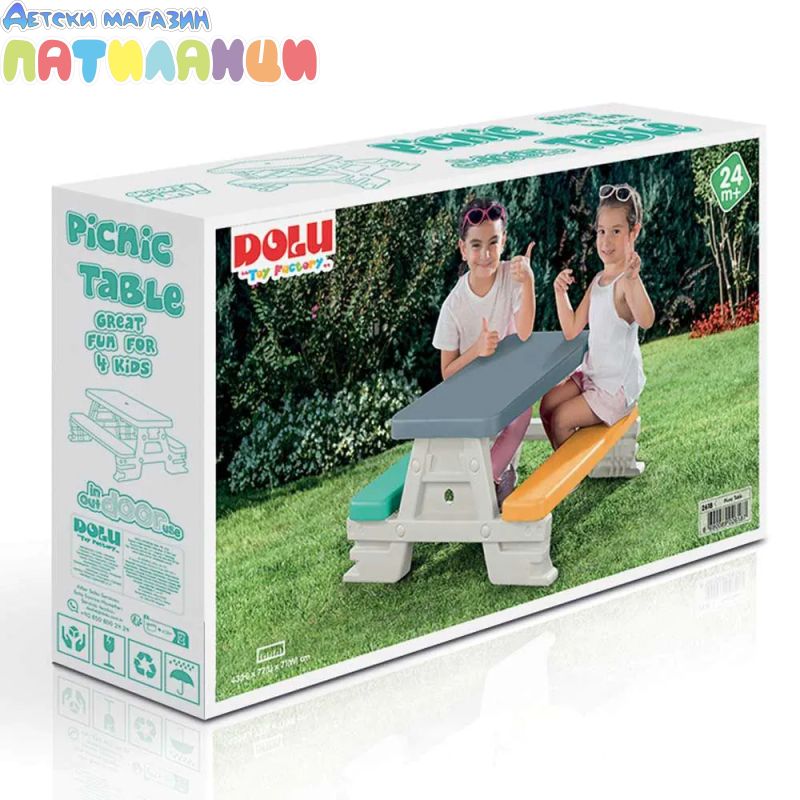 Маса за пикник с вградени от двете си страни пейки, на които могат да седнат до 4 деца.