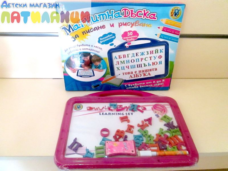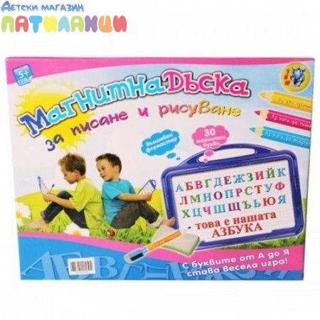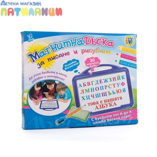 Магнитна Дъска за Писане и Рисуване. Най - добрият домашен учител за всички деца! Невероятен комплект, включващ двустранна магнитна дъска, магнитни цветни буквички и цифри, както и вълшебен маркер с гъба за почистване. Сега научаването на азбуката и смятането е толкова лесно, забавно и интересно! А когато не Ви се учи, отдайте се на разпускащо творчество върху бялото платно.