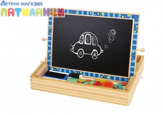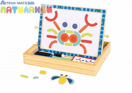 Креативна двустранна магнитна дъска за редене. Комплектът съдържа 117 части в различни форми и цветове. Това е игра тип пъзел, с която детето ще може да реди фигури по шаблони или да измисли свой собствени. От едната страна е магнитна дъска , а от другата черна дъска за писане с тебешир. Играта стимулира развитието на творчеството, фината моторика, въображението, координацията. Комплектът включва 30 различни шаблони за редене със степенувани нива на трудност. Тебешир и гъба.