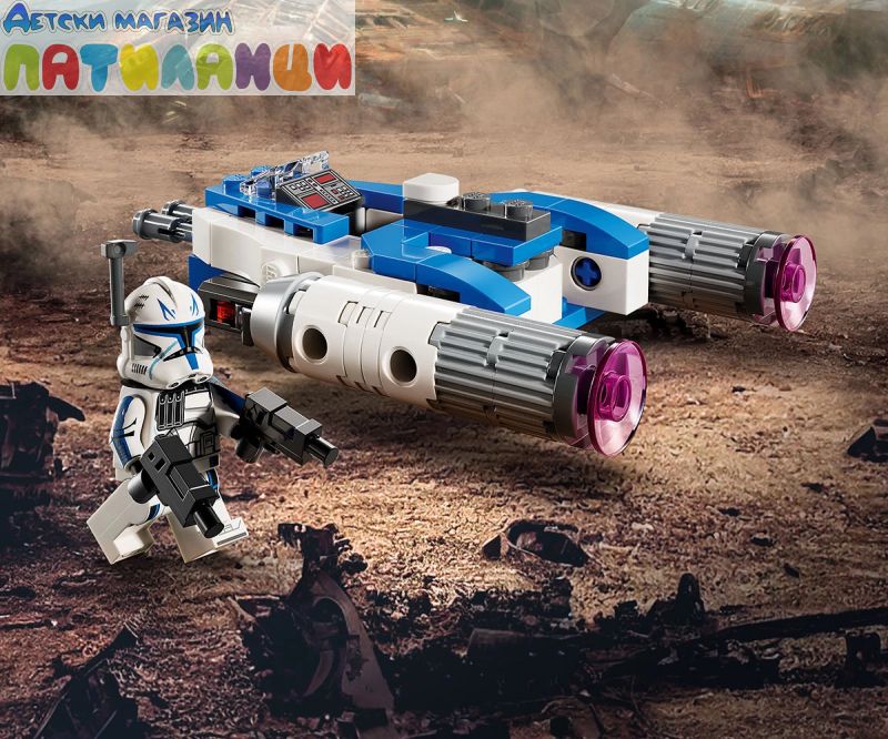 Първият по рода си модел от тухлички LEGO® Y-wing на капитан Рекс – този миниатюрен изтребител LEGO Star Wars™ има пилотска кабина с място за минифигура LEGO и 2 оръдия;