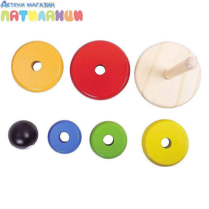 Има 5 кръгчета, които оформят пирамида. Те са в основните цветове - жълт, син, зелен, червен и оранжев.