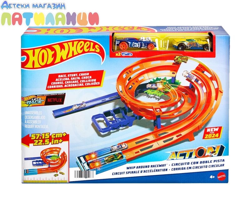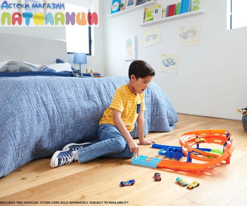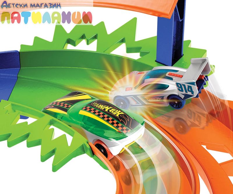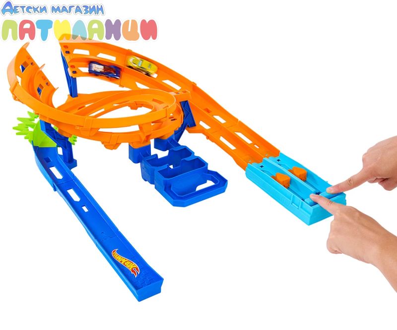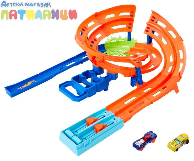 - Пригответе се за състезания и катастрофи с Hot Wheels Писта с камшичен удар;