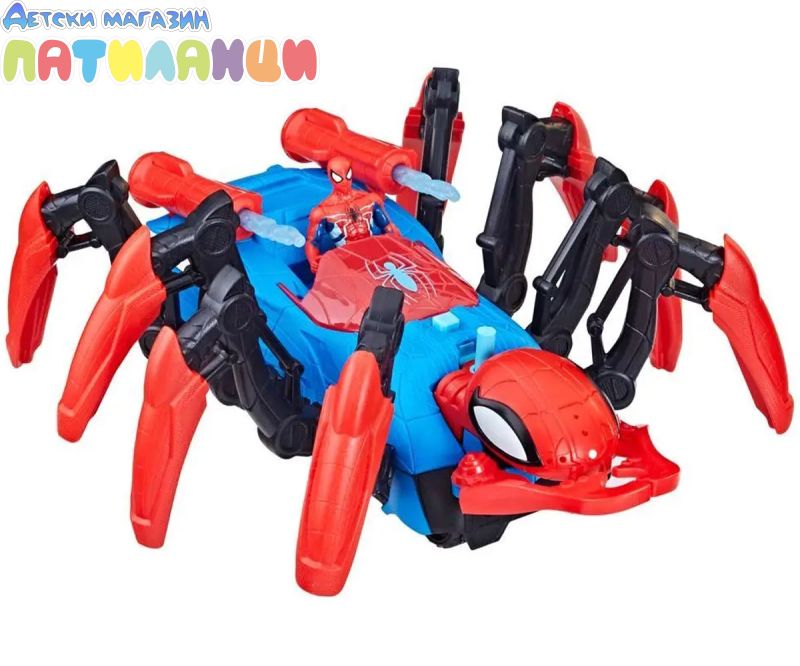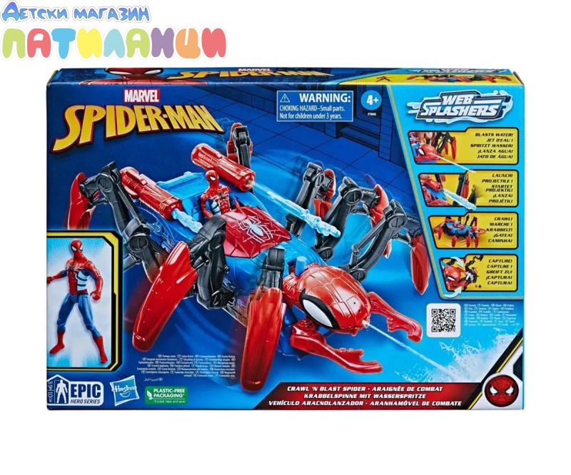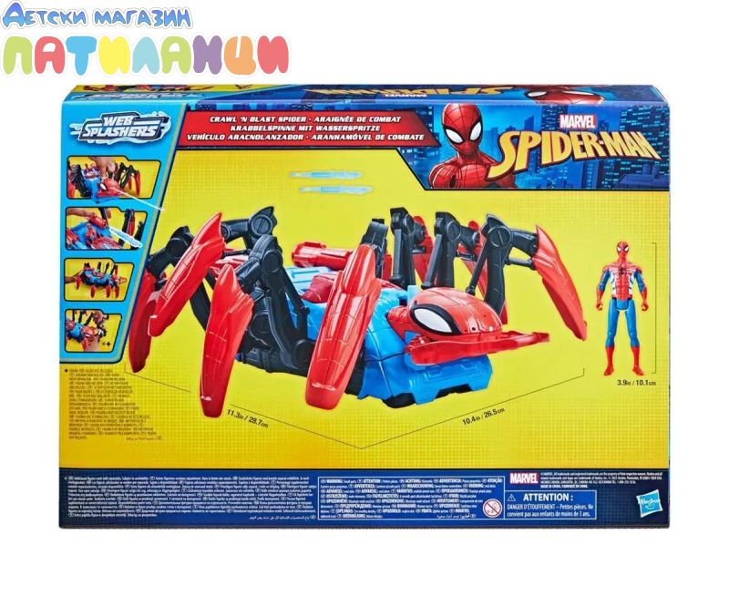 Търсите още героичен екшън със Спайдърмен? Crawl 'N Blast Spider прави повече от това просто да ускори вашия любим герой, който се люлее в мрежата, за да ви помогне! Този комплект играчка кола включва 10 см съчленена фигура на Спайдърмен, която децата могат да поставят в Crawl 'N Blast Spider. Деца на 4 и повече години могат да напълнят отделящата се глава на паяк с вода и да активират функцията за водна струя с натискането на един бутон! Играчката кола Spider-Man може също да взривява включени снаряди в мрежата. Бутайте превозното средство Spider и гледайте как всичките 8 крака се движат и пълзят като паяк. Представете си как побеждавате враговете на Спайдърмен, като ги улавяте в подобната на клещи хватка на Crawl 'N Blast Spider. Тази играчка Spider-Man е страхотен подарък за фенове на 4 и повече години!