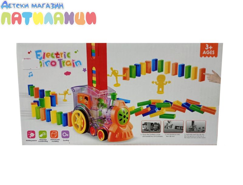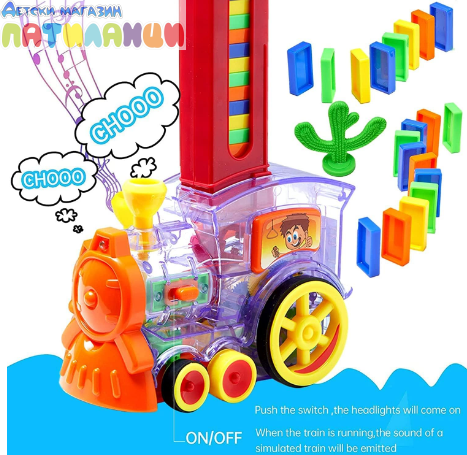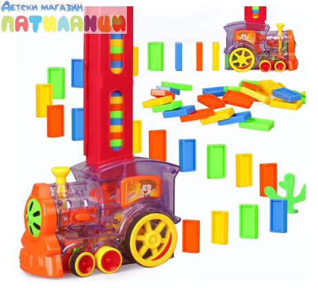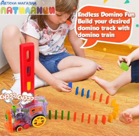 Докато влакът се движи напред, доминото ще бъде депозирано изправено в един ред.