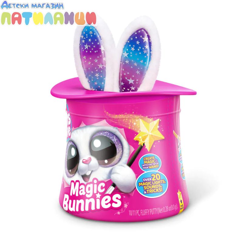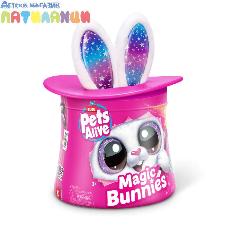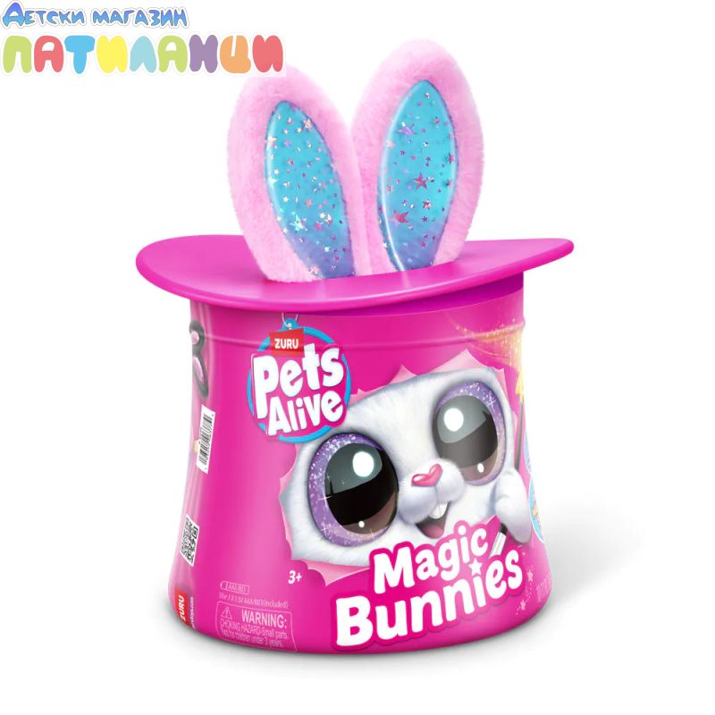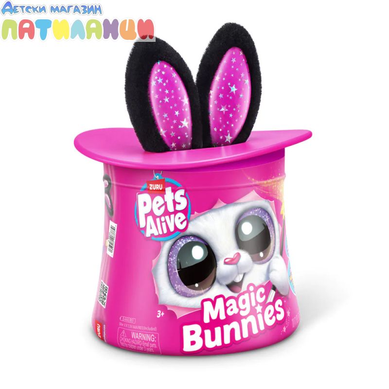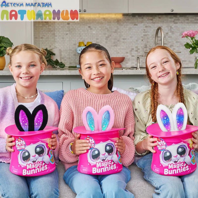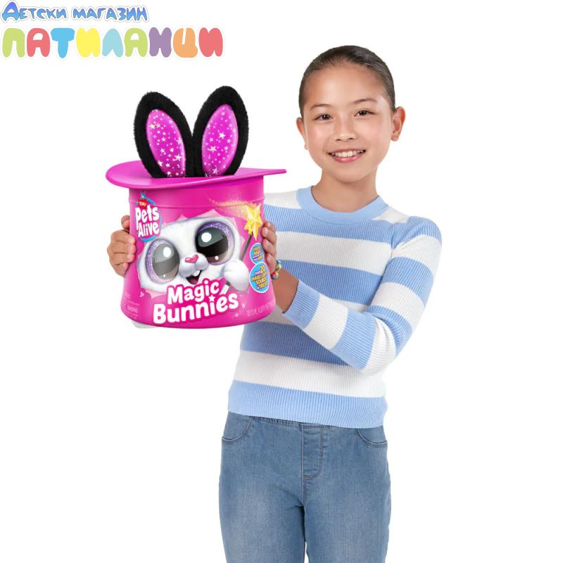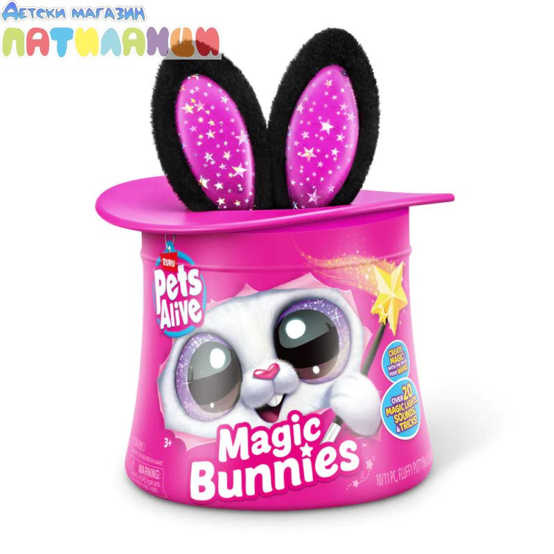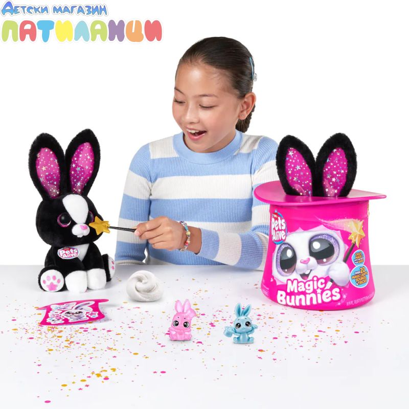 Абракадабра! Запознай се с твоя най-сладък нов магически асистент с Pets Alive Magic Bunnies. Размахай очарователната си звездна пръчица, за да видиш как ушите на зайчето светват и магията започва... Слушай мистериозните звуци на заклинанието! ТА ДААА...Издърпай твоето зайче и виж как изскачат конфети. Кое магическо зайче ще извадиш от цилиндъра - черното, розовото или бялото? Цели 3 за събиране, всяко се продава отделно. Открий тайното отделение - колко вълшебни мини зайчета ще намериш скрити вътре? Всяко зайче идва със собствен уникален магически трик!