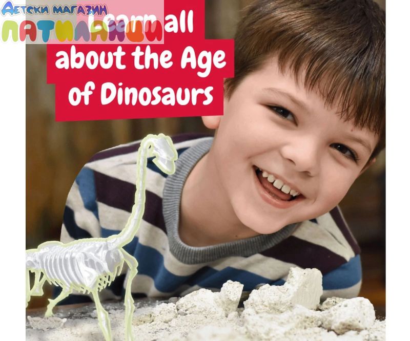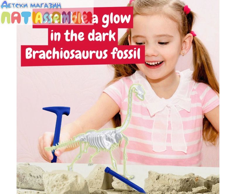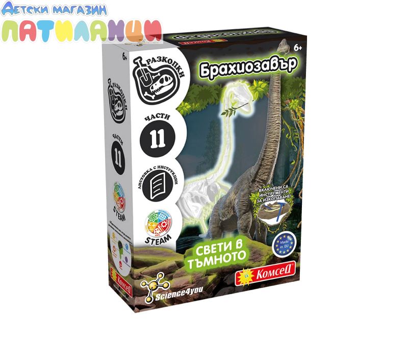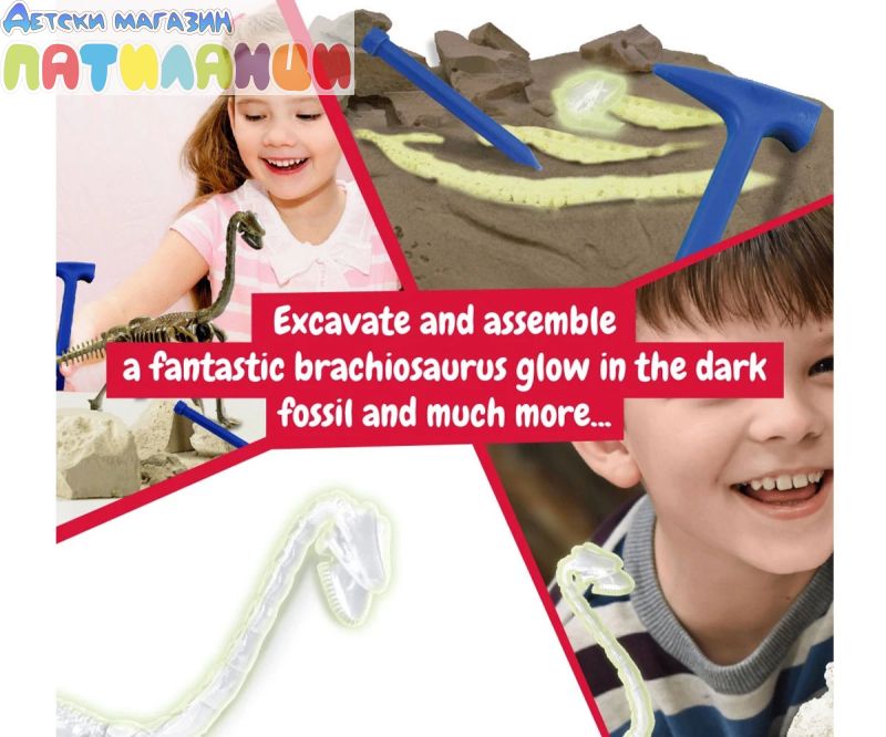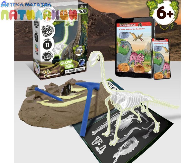 Влезте във фантастичния свят на динозаврите със Science4you и разкопайте динозавъра Брахиозавър, който свети в тъмното. С този комплект ще научите най-добрите техники за разкопаване на фосила на Брахиозавъра и след като искате всички части, просто сглобете динозавъра си и вижте като свети в тъмното. Перфектната играчка за всички, които обичат динозаври и Джурасик свят. Препоръчителна възраст: над 6 години. С тази играчка от Science4you ще направите първите си стъпки в света на разкопките. Ще разкопаете и сглобите своя собствен динозавър и ще видите като свети в тъмното. Удивително, нали? Открийте какво са фосилите и какво е довело до изчезването на динозаврите. Започнете това приключване на откритието и научете повече за любимите си динозаври. Включва онлайн образователно ръководство на 7 различни езика (португалски, испански, английски, френски, немски, италиански и холандски).