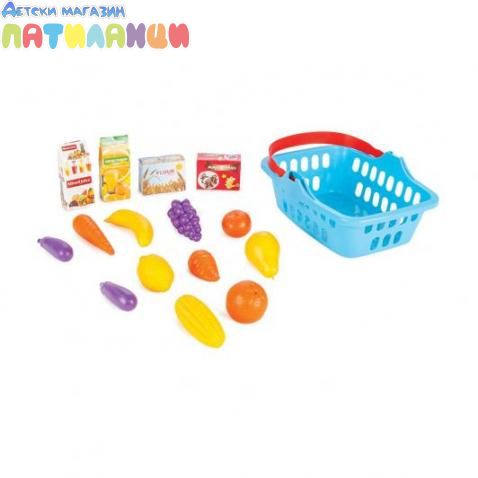 Комплектът включва пет различни по вид плодове и зеленчуци, както и две картонени кутии, имитиращи хранителни продукти.