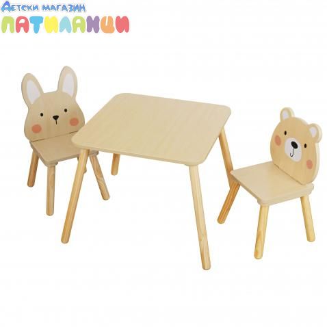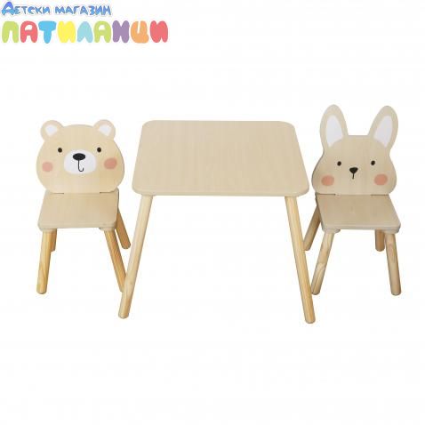 Дървена маса с 2 стола Зайче и Мече W08G410