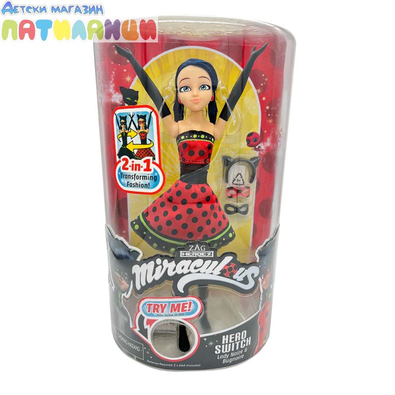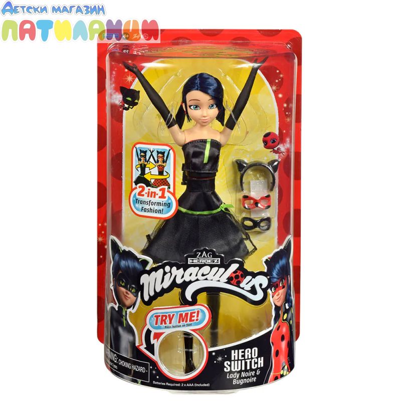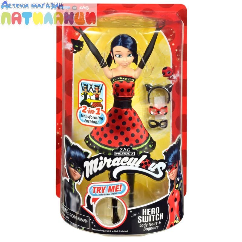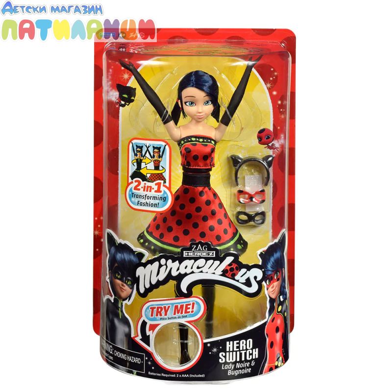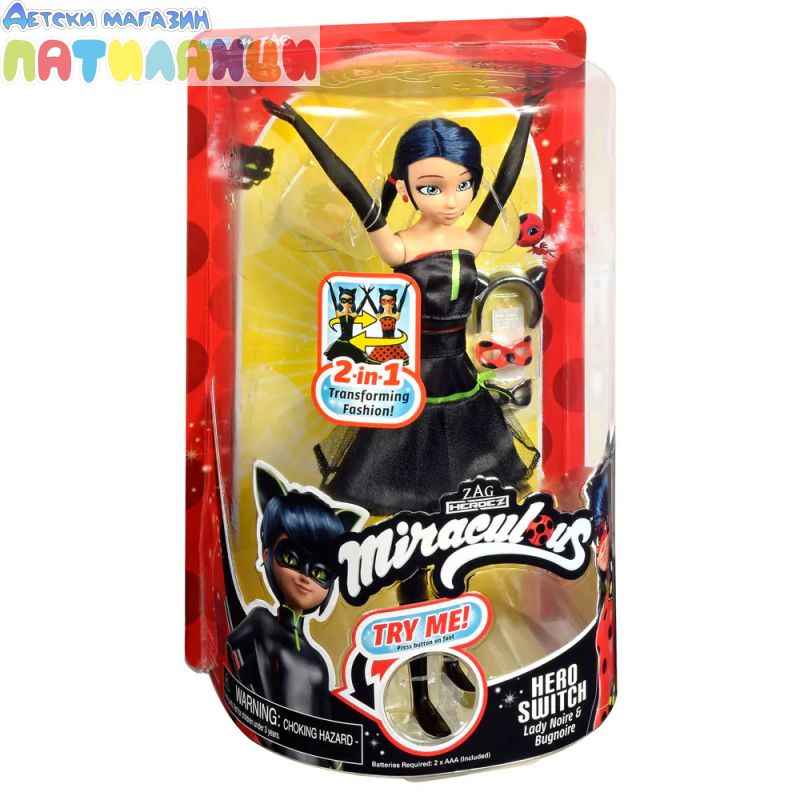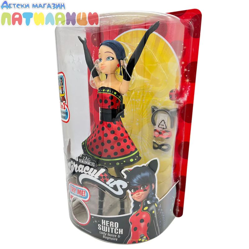 Маринет се превръща в двама чудесни героя с натискането на един бутон! Натисни бутона на крака на Lady Noire и гледай как нейният костюм на супергерой се върти, за да разкрие Bugnoir! Върни се към Lady Noire, като натиснеш бутона още веднъж - можеш да превключваш стиловете отново и отново!