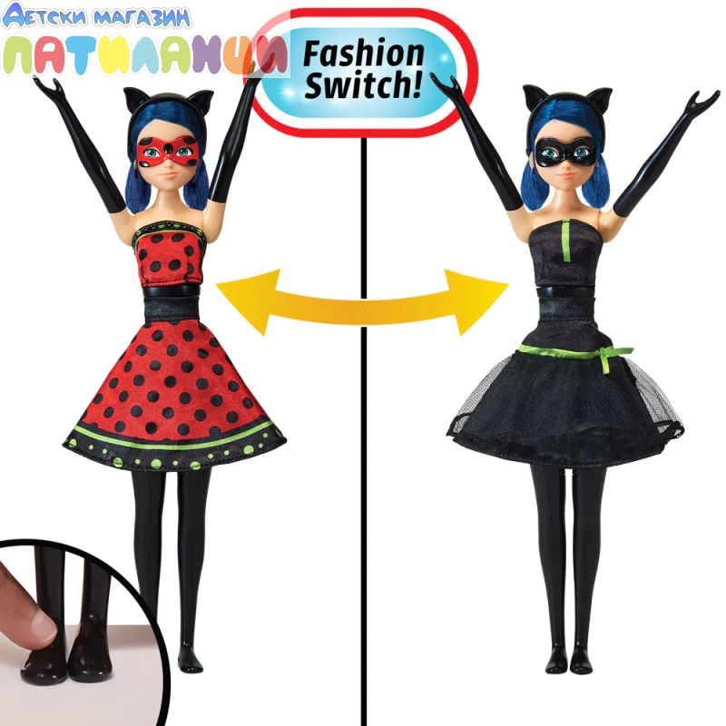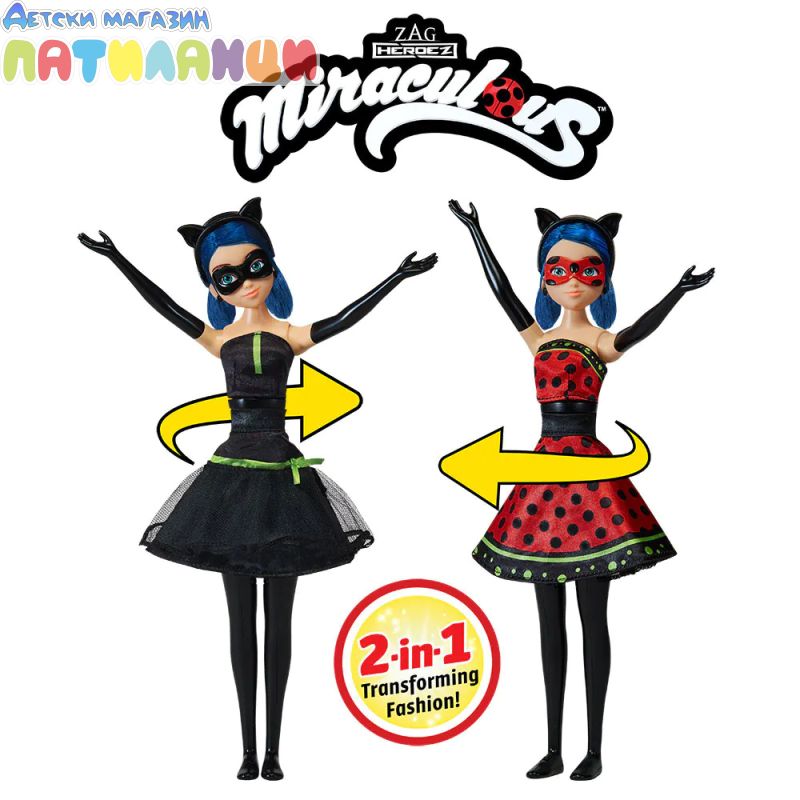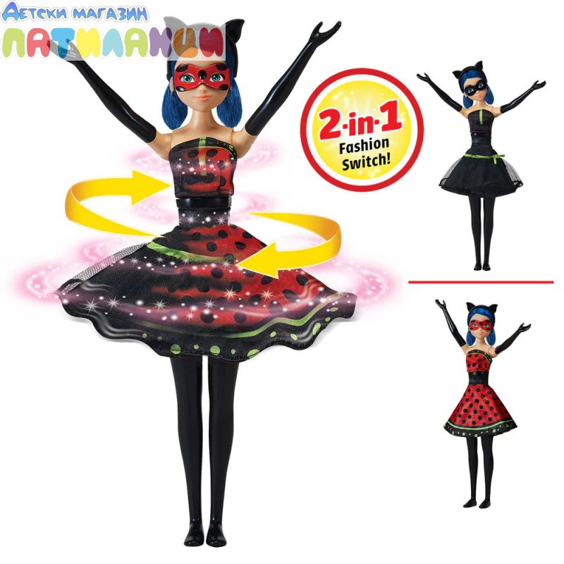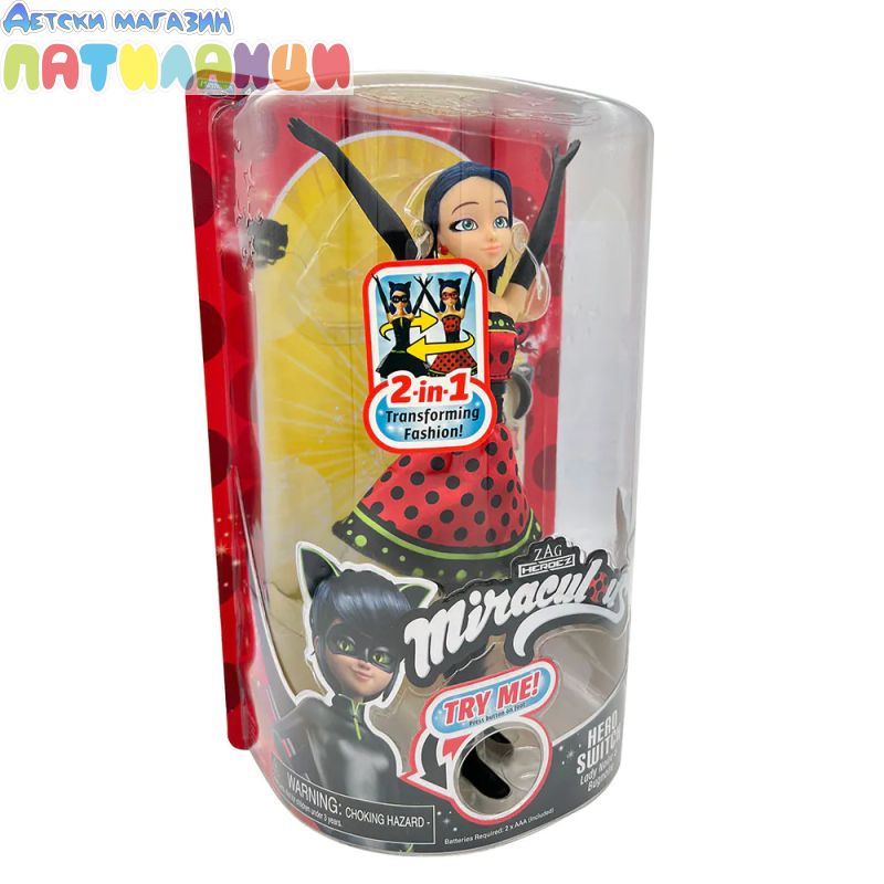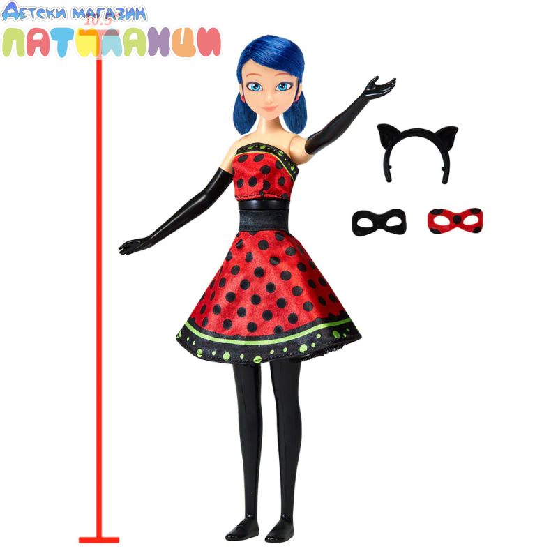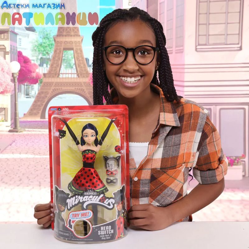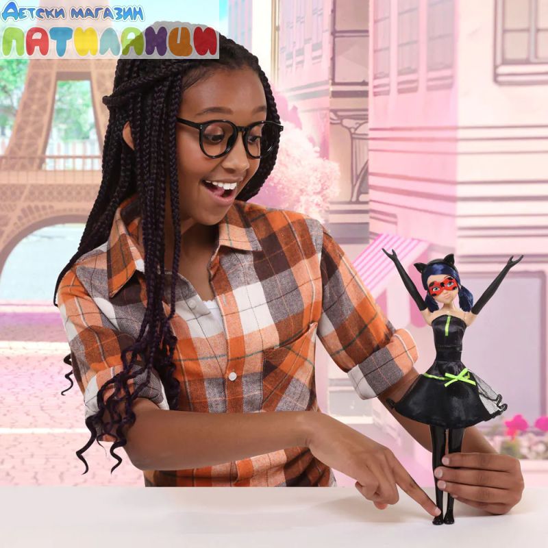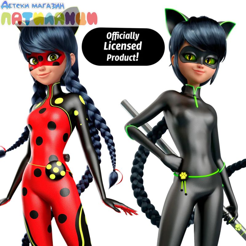 Комплектът включва автентична 26-сантиметрова модна кукла Ladybug, лента за глава с котешки уши и две подвижни маски — по една за всеки супергерой!