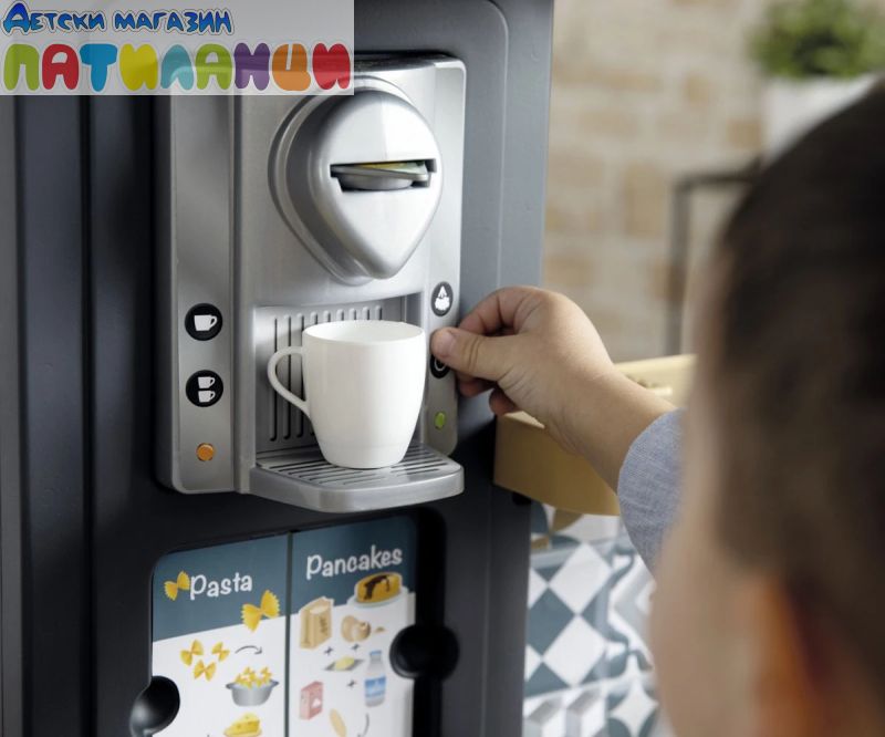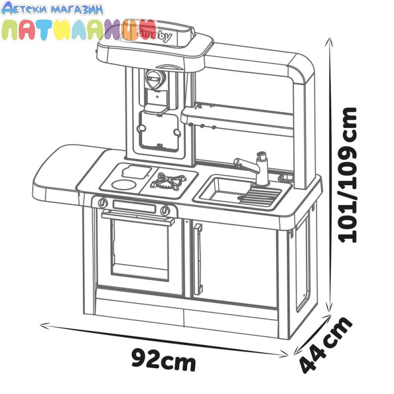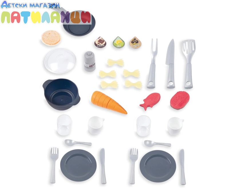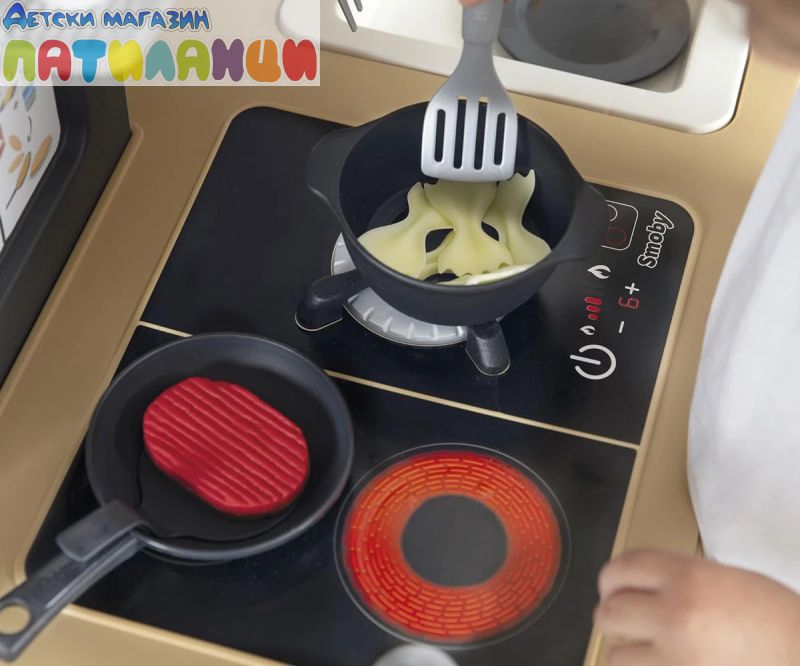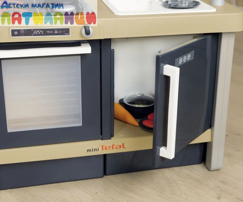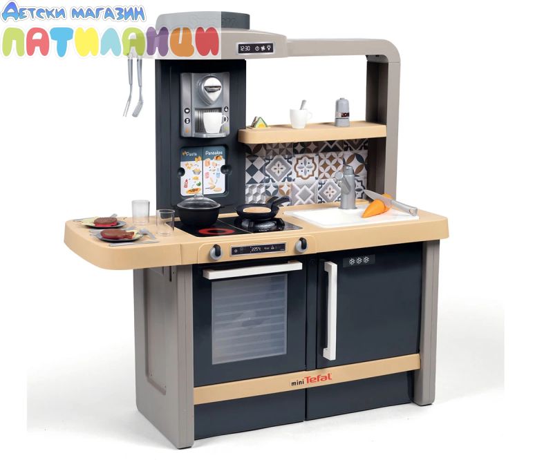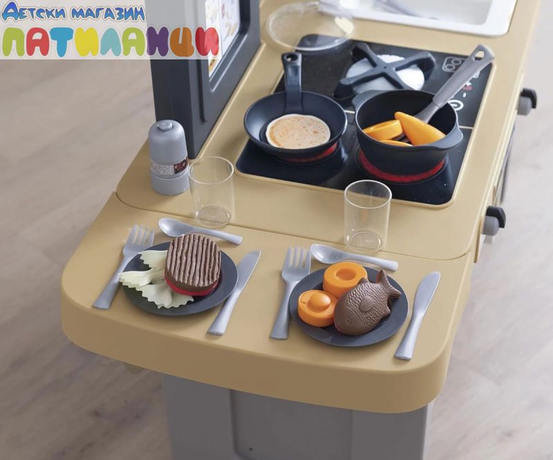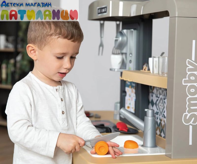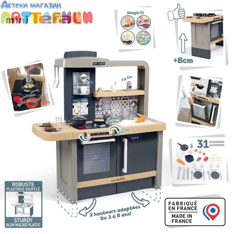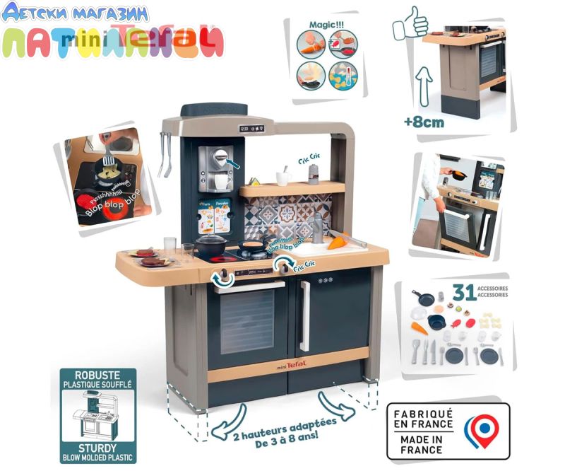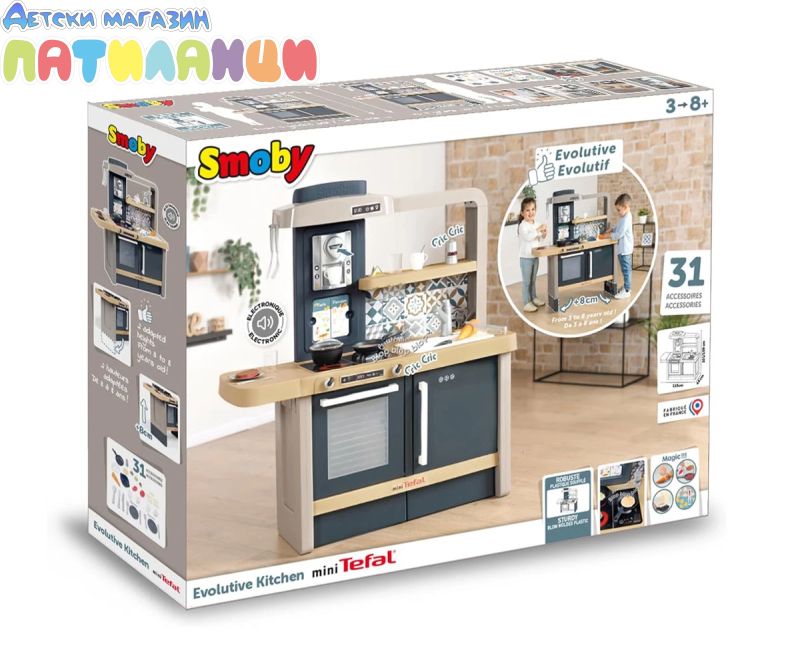 Тефал Evo от Smoby е детската кухня, която расте с вашето дете! Благодарение на високо регулируемия работен плот, дизайнерската кухня може лесно да се адаптира към ръста на детето. Двете предни панели се поставят на крачетата, а работният плот нараства от 50 до 58 см. Освен това, изключително стабилната кухня се отпечатва с фурна с подвижна решетка, хладилник с плот, котлон с 2 горелки и електрически звуков модул в едно от горелките, мивка и аспиратор с интегрирана еспресо машина. Кухнята идва с много детайлни аксесоари, като солници и пиперници със "щрак" звук, магически тиган за палачинки, който улеснява обръщането им във въздуха, съдове и прибори, както и различни пакети с "храни". Температурочувствителната паста променя цвета си, когато я поставите в съда със студена вода, а моркова може да бъде "нарязан" от децата на отделни резени. В комплекта има включване и съдове и чаши. Ролевата игра е важна част от детското развитие. Чрез пресяване на ежедневни ситуации, социалните умения се тренират и задълбочават. С широкия си набор от аксесоари, стилен дизайн и реалистични функции, висококачествената играчка кухня Tefal Evo предлага много пространство за креативност и въображение. Висококачествените материали и международните технологии за производство, произведени във Франция, гарантират дълго и безгрижно удоволствие от играта и осигуряват особено високо качество.