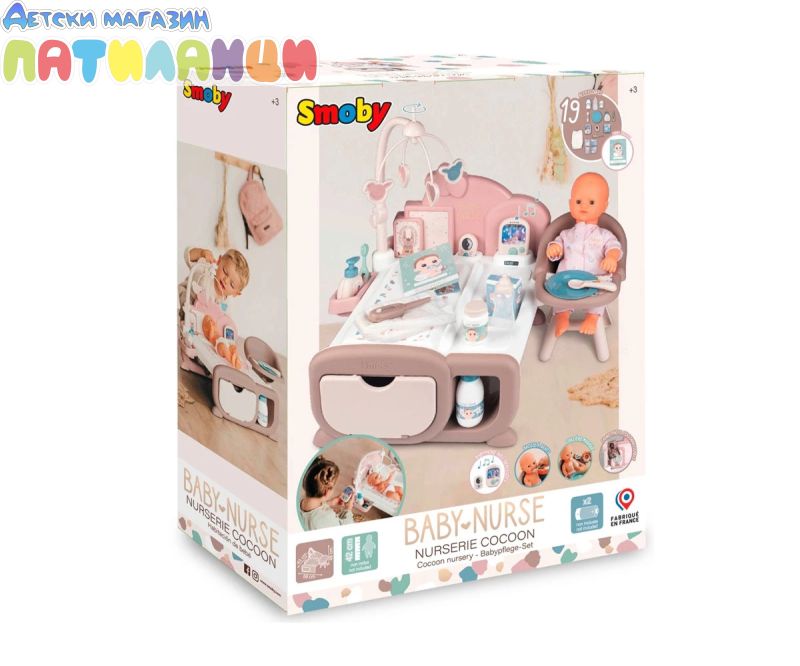 Просто очарователна е стаята за игра за кукли Baby Nurse Cocoon, която съчетава три зони за игра в един продукт. Така родителите на кукли могат да се грижат за своите малки сладури, точно като мама и татко. Стаята за кукли Cocoon се състои от комбинирана зона за спане и преобличане, която е оборудвана с персонализирана рамка за картина, въртящ се мобилен телефон, както и електронен бебефон с различни приспивни песнички и фиктивна камера. Зоната за хранене включва въртящ се стол за хранене с вградена табла, където куклите могат да ядат първите си каши. Центърът за игра Cocoon има и няколко отделения за съхранение, в които да съхраните обширните аксесоари. В допълнение към бебефона и камерата, комплектът включва бебешко шише, чиния, пелена, дозатор за сапун с функция помпа, бутилка за мляко, бебешка бутилка, четка за зъби, термометър за температура, четка за зъби и чиния с лъжица.