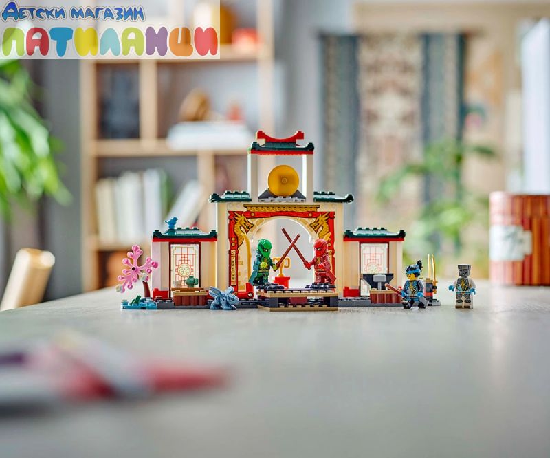 С много възможности за игра – детайлният храм на нинджите се състои от чайна, зона за тренировки с оръжие, малка градина и турнирна арена с 2 въртящи се бойни плочи;