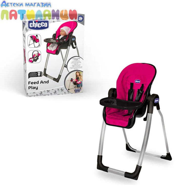 Перфектният комплект за малки "родители", за да хранят и забавляват своите кукли. Chicco Feed & Play разполага с три различни режима на игра: столче за хранене, люлка и столче за кола. Храни куклата си бебе в столчето за хранене, допълнено с табла за хранене, преди да го превърнеш в бебешка люлка и да го оставиш за дрямка. Столчето за кола може да се отделя, за да транспортираш куклите си лесно и удобно