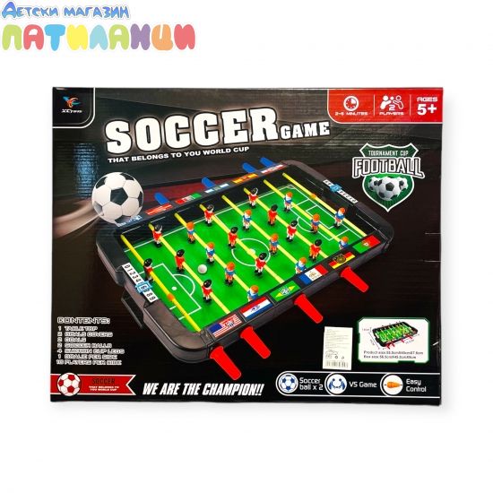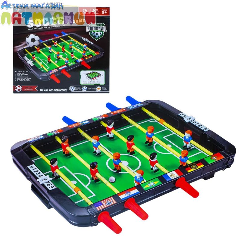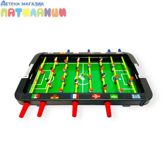 Футболът на маса никога не е бил по-вълнуващ! Играй бърза игра с цялата тръпка на традиционната маса за джаги - включително преобръщания и ритници към вратата.Всеки играч контролира 3 реда играчи, докато се опитва да надмине и да надстреля опонента си, за да отбелязва голове и да победи! Вградените плъзгащи се проследяващи резултати ви информират кой води. Кой играч ще бъде първият, който ще отбележи 9 гола?!