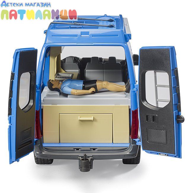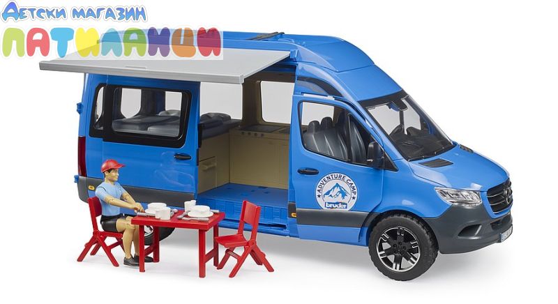 Къмпингуването е абсолютно в тенденция. Регистрациите на мобилни домове в цяла Европа достигнаха нови висоти през 2018 г. и 2019 г. Тази вълнуваща тема за свободното време вече може да бъде изпитана от младите къмпингуващи в BRUDER. Новият MB Sprinter е изключително успешен и като базов модел за кемпери. Версията BRUDER на новия кемпер MB Sprinter има впечатляващо ниво на детайлност и гъвкавост. Вратата на кабината на водача и задните врати се отварят. Тук предоставената фигура bworld има достъп до интегрираното двойно легло и голямо отделение за съхранение. Особен акцент е новоразработената плъзгаща се врата от страната на водача, която осигурява достъп до кухненския модул. Кемперът има разтегателен сенник за слънчеви дни, както и стилни къмпинг мебели и сервизи. Страхотни аксесоари за кемпера са каякът bworld (арт. № 63155), който може да се транспортира на покрива.