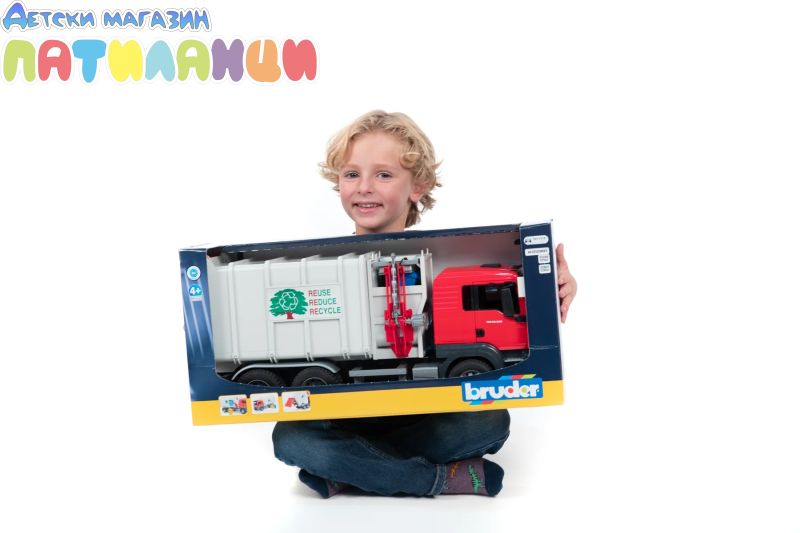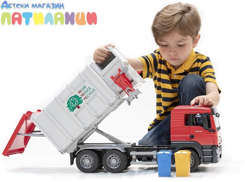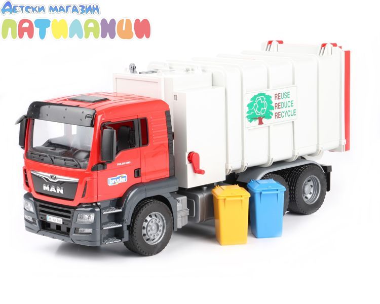 Man TGS е перфектният универсален автомобил за строителни обекти, транспорт на дълги разстояния и местна дистрибуция. Здраво изработен, оборудван с мощни двигатели и с полезен товар над средния, този камион е прототипът на многократно описвания „универсален автомобил“, който има много иновации на борда. Това допълнение към автопарка на Bruder е модерен камион със страничен товарач, базиран на Man TGS. Странично изтеглящ се повдигач хваща кофите за боклук и ги изпразва без помощта на втори човек, две винтови преси транспортират боклука вътре в товарното тяло, което се накланя, за да го изпразни, а отворената задна врата се заключва.