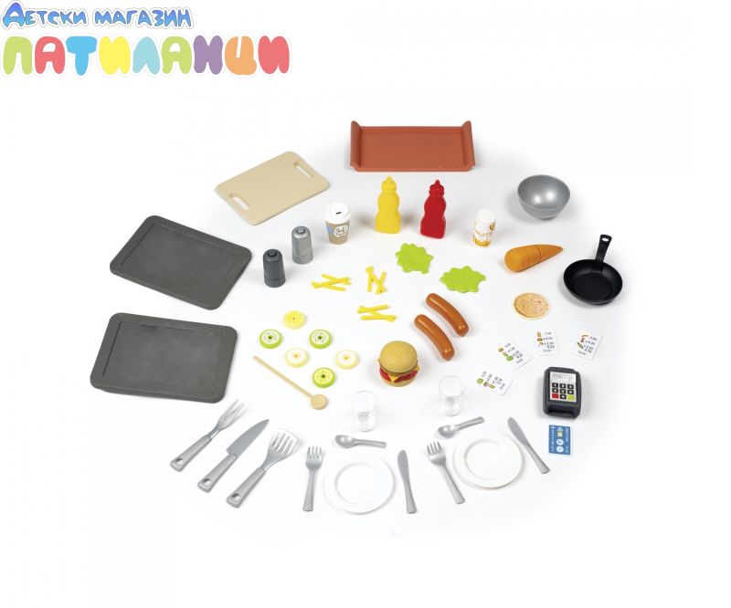 Включени са много функции за игра: 1 хладилник, 1 фурна, 1 газов котлон с прибиращ се пламък, 1 мивка с 1 кран, 1 касов апарат с касово чекмедже и 1 четец на кредитни карти и 2 рафта за съхранение на аксесоари. Стотици истории могат да се измислят между малки приятели! Включени са много аксесоари, включително сладки и солени храни, напитки, прибори за хранене, кухненски прибори, банкова карта и билети, солница и пиперник, тиган за хвърляне на палачинки, сосове с кетчуп и горчица, ...
