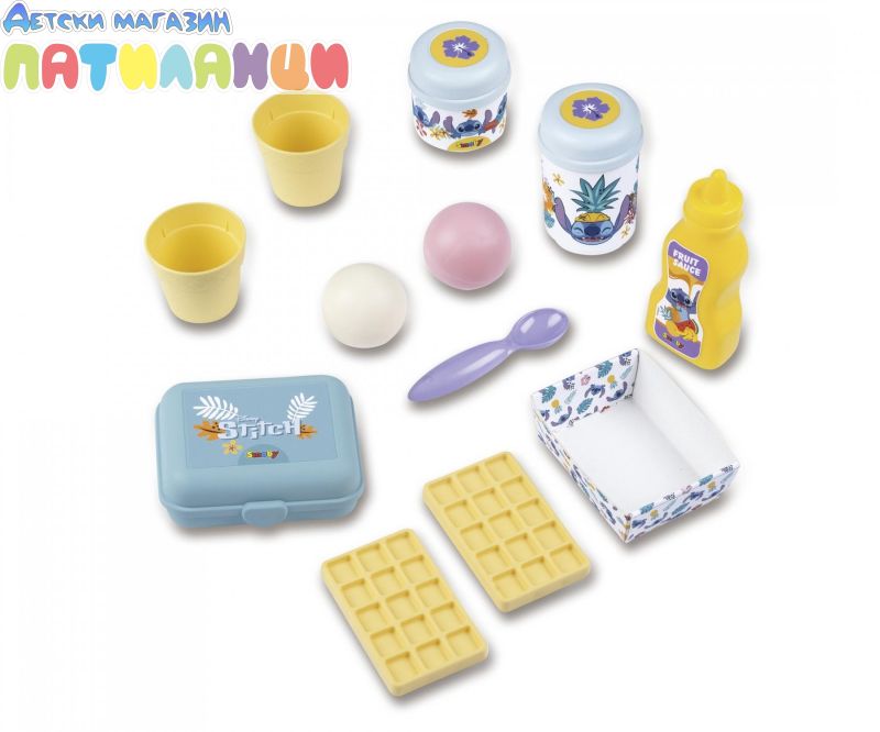 Комплектът включва 12 аксесоара, включително две фунийки за сладолед, две лъжички за сладолед, форма за гофрети, прибори за хранене, кутия за обяд и контейнери за игра с мотиви за вкусни топинги. Децата могат да бъдат креативни и закачливо да украсят своите вафли или сладоледени мелби. Разнообразните функции не само насърчават въображението, но и социалните и двигателните умения.