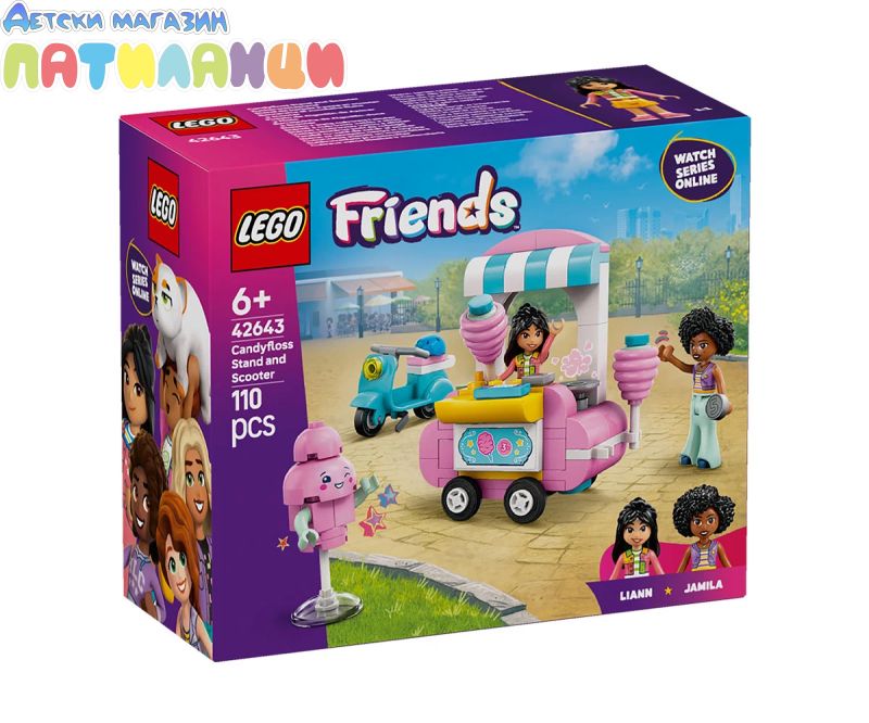 Вдъхновете сладката въвеждаме игра за деца на възраст над 6 години с играча LEGO® Friends Щанд за захарен памук и скутер (42643). Комплектът предлага 2 миникукли LEGO Friends и разполага с подвижна количка за храна за конструиране, скутер, талисман и аксесоари. Момичетата, момчето и всеки малък строител, който обича творческата игра, може да се забавлява, измисляйки своите собствени истории с този комплект. Той разказва историята на Лиан и Джамила, които обичат да прекарват време заедно на щанда за захарен памук. Превозното средство LEGO тегличката с колела, което включва купа и добавки за създаване на изкушения от захарен памук. Има също касов апарат и пари, така че децата да могат да разиграват различни сцени с клиентите. Разгледайте и други играчки за творческо строителство за деца във вселената на LEGO Friends, където ще откриете още много истории за приятелството (комплектите се продават отделно). Комплектът се предоставя с приложението LEGO Builder за интуитивно строителство. С него децата могат да машинират и завъртат модели в 3D, да запазват комплекти и да проследяват напредъка.