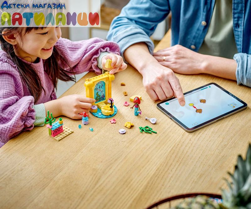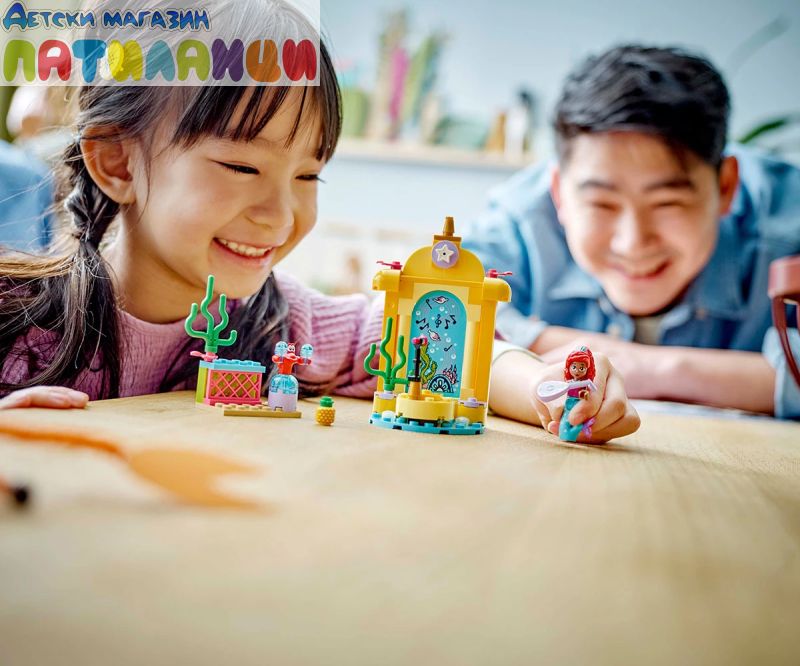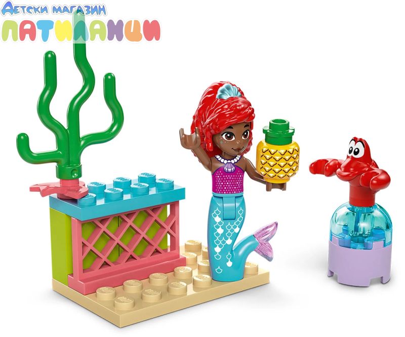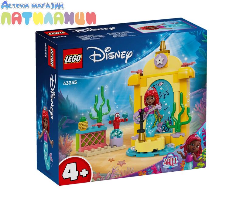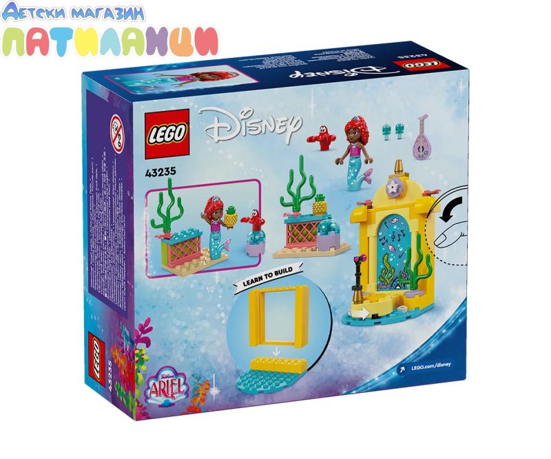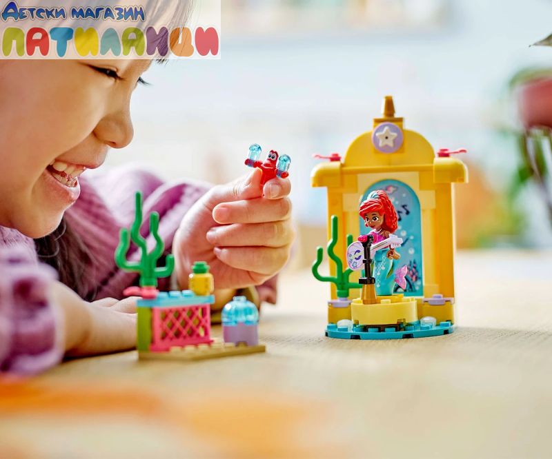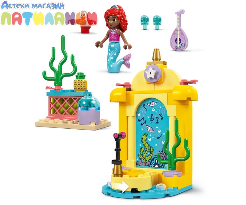 Строителен комплект за игра – Този комплект за изграждане има музикална сцена, вдъхновена от сериала Ариел по Disney Junior, фигура миникукла на Ариел от LEGO® ǀ Disney и фигура на Себастиан от LEGO ǀ Disney;